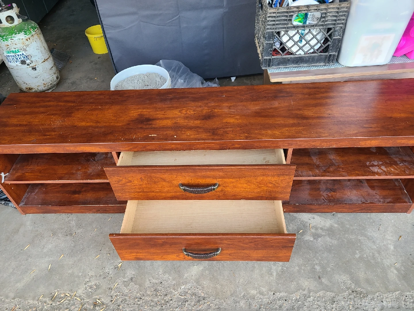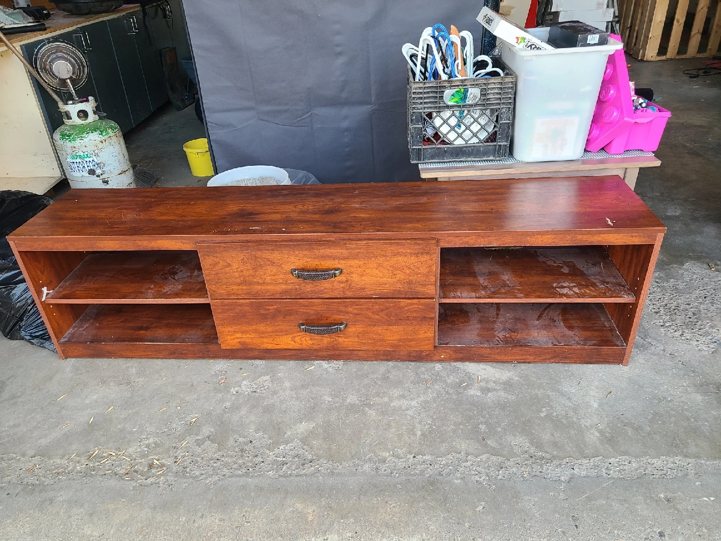 15Selling a wooden TV stand with two drawers. It's in good used condition and perfect for storing your media components or displaying decor. The stand has open shelving on either side of the drawers for additional storage or display space.