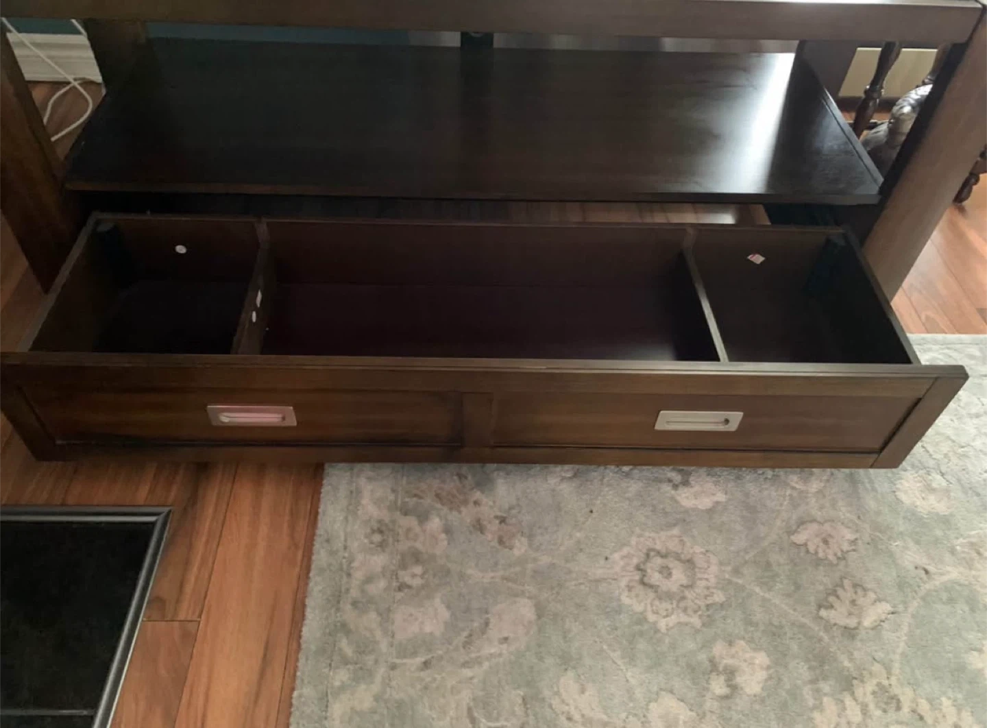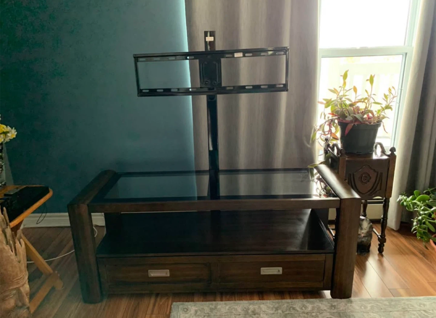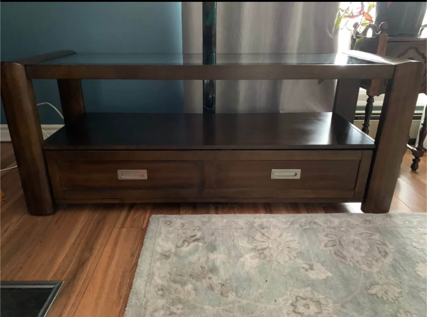 5Selling a sturdy wooden TV stand with a sleek glass top. It features a large drawer for storage and a modern design that fits well in any living room. It's in great shape and ready for a new home!