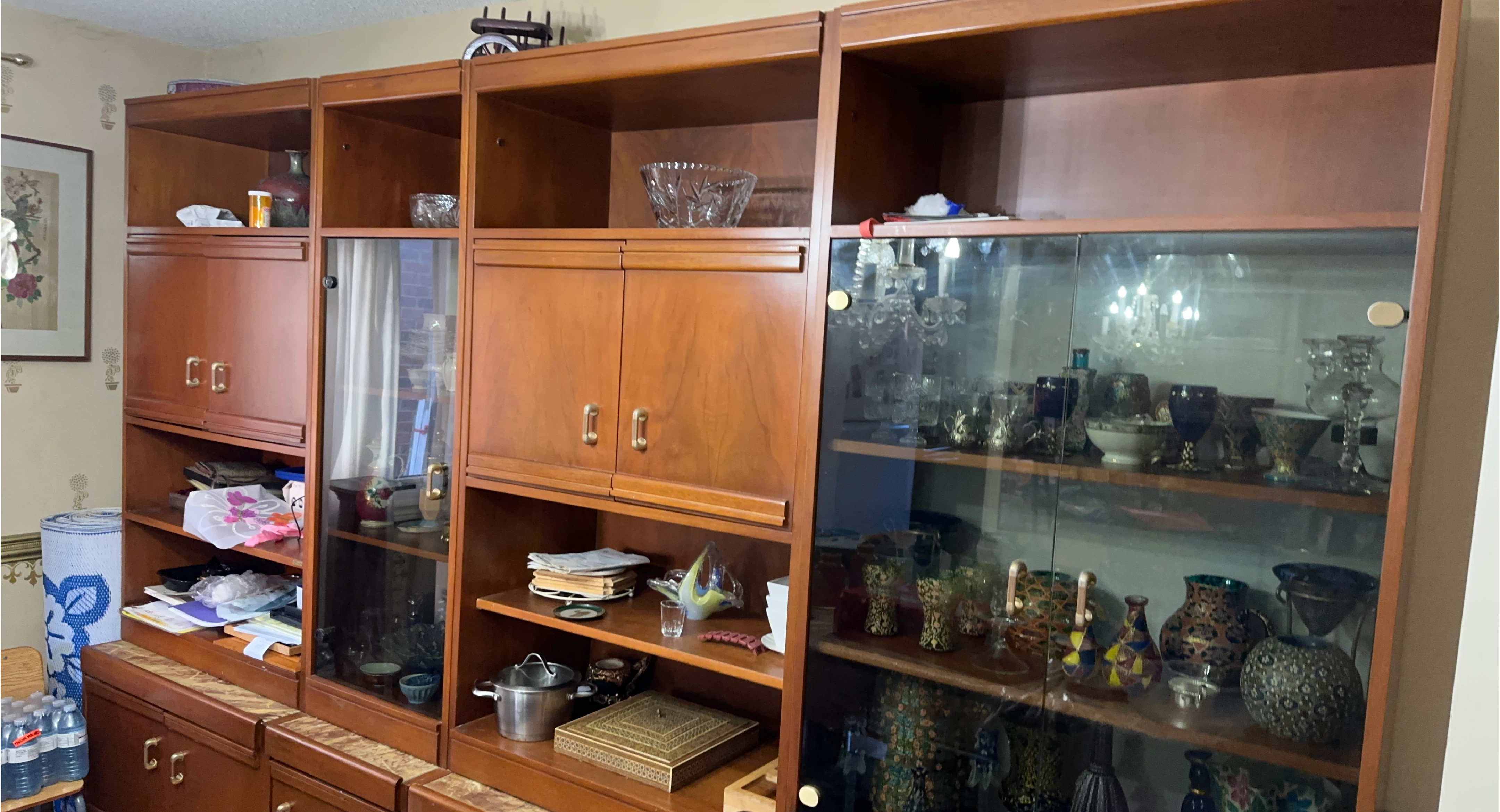 10Selling a wooden wall unit that has a lot of storage! It features both open shelving and cabinets. There's also a glass display section for showing off your favourite items. It's a great piece for any living or dining room. For pick up only