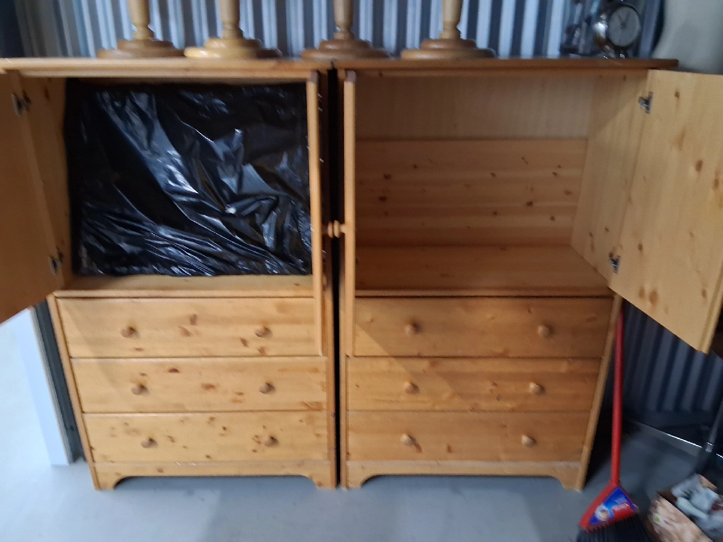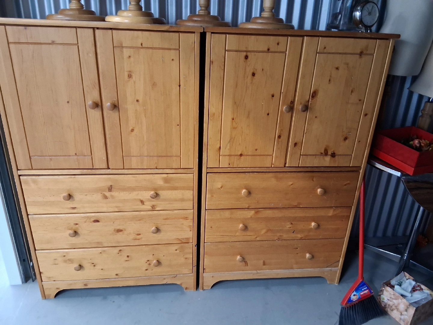 Here are two wooden wardrobes, each featuring a cabinet on top and three drawers below. They're perfect for adding some extra storage to any room in your house. They are in good condition and ready for a new home