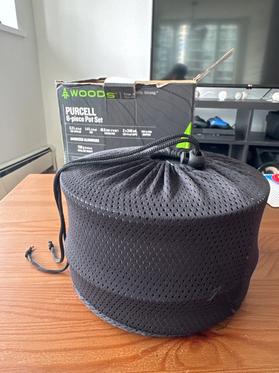 Selling a Woods Purcell 6-piece pot set! This set includes: - 2.2L pot with lid - 1.4L pot - 18.5 cm frying pan - 2 x 240 ml cups - Pot and pan gripper Made of anodized aluminum, this lightweight set is perfect for camping and outdoor cooking
