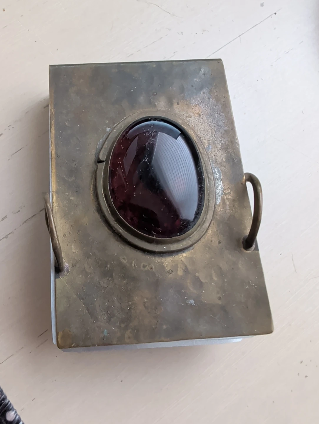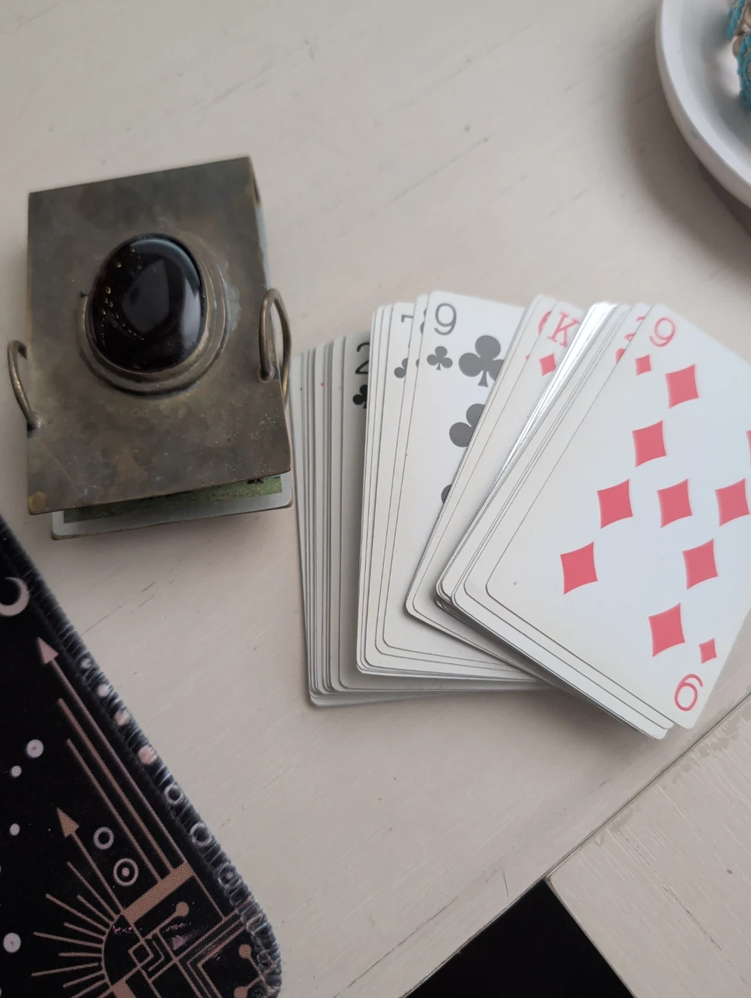 This is a vintage playing card holder made by Rafael Canada. It's crafted from brass and features a decorative red stone accent on the front. It includes a small set of playing cards.
