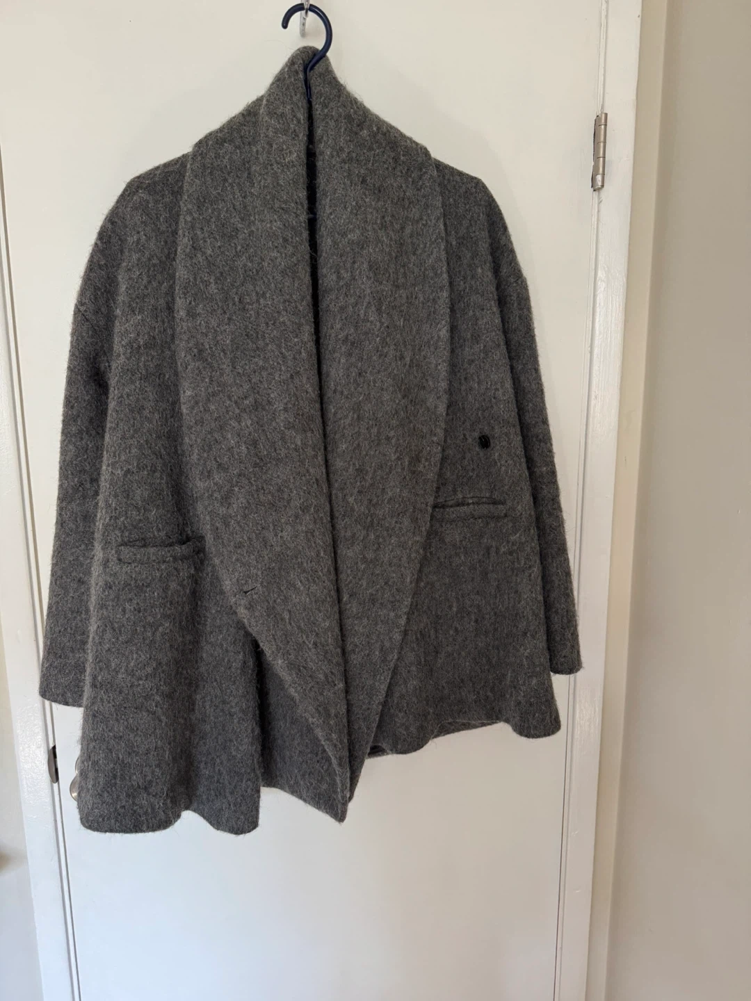 Warm, easy fully lined wool jacket. Paid over $200 on Etsy. Mint condition. Front pockets with a one button closure. Sleeve length is 20” from a dropped shoulder. Coat length is 30”ish.