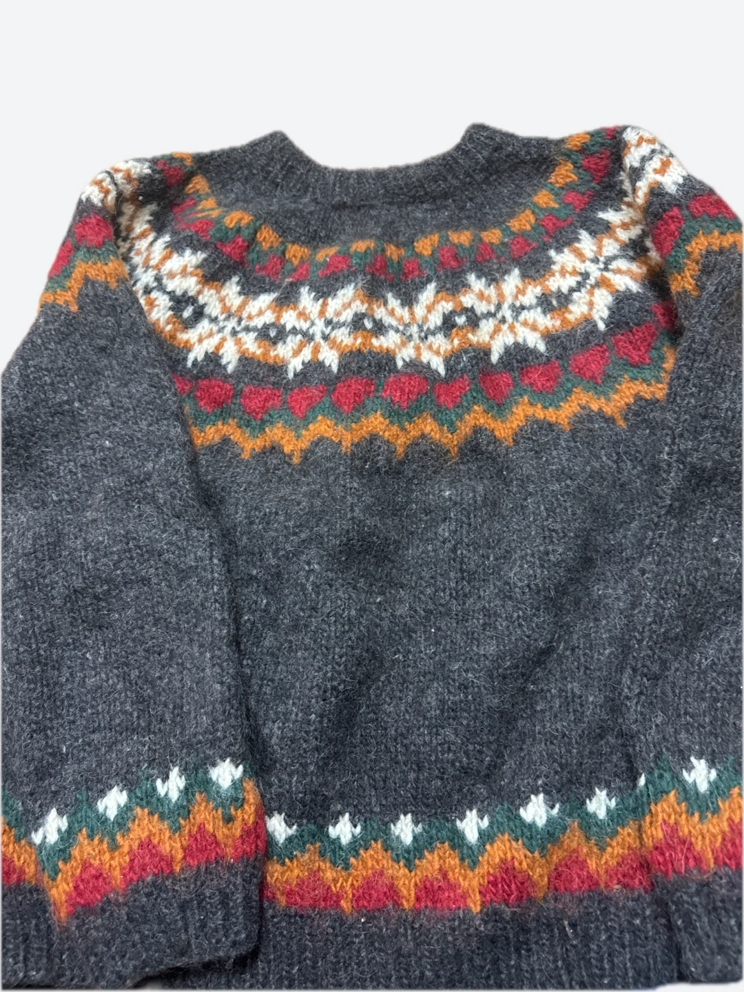 Here's a cozy wool sweater, perfect for staying warm! It features a lovely pattern around the neck and wrists. The sweater is grey and made of wool, making it super comfy for those chilly days