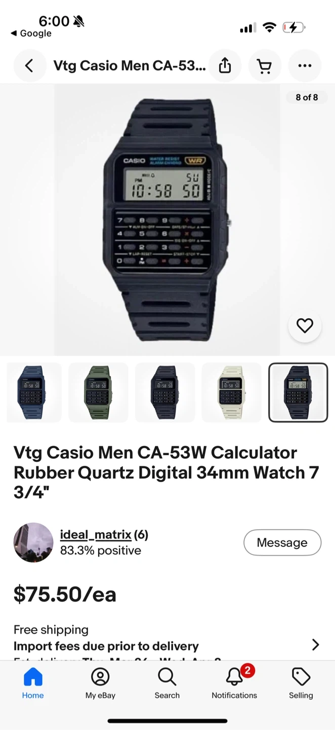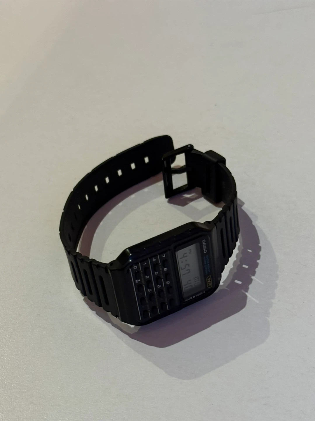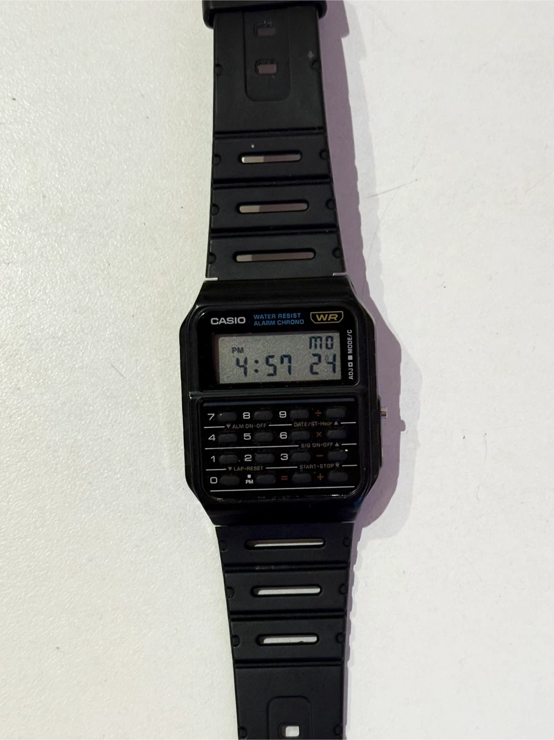 Black Casio calculator watch with alarm and chrono functions. It's water resistant and has a digital display. Includes date, time, and stopwatch capabilities. Condition is great!