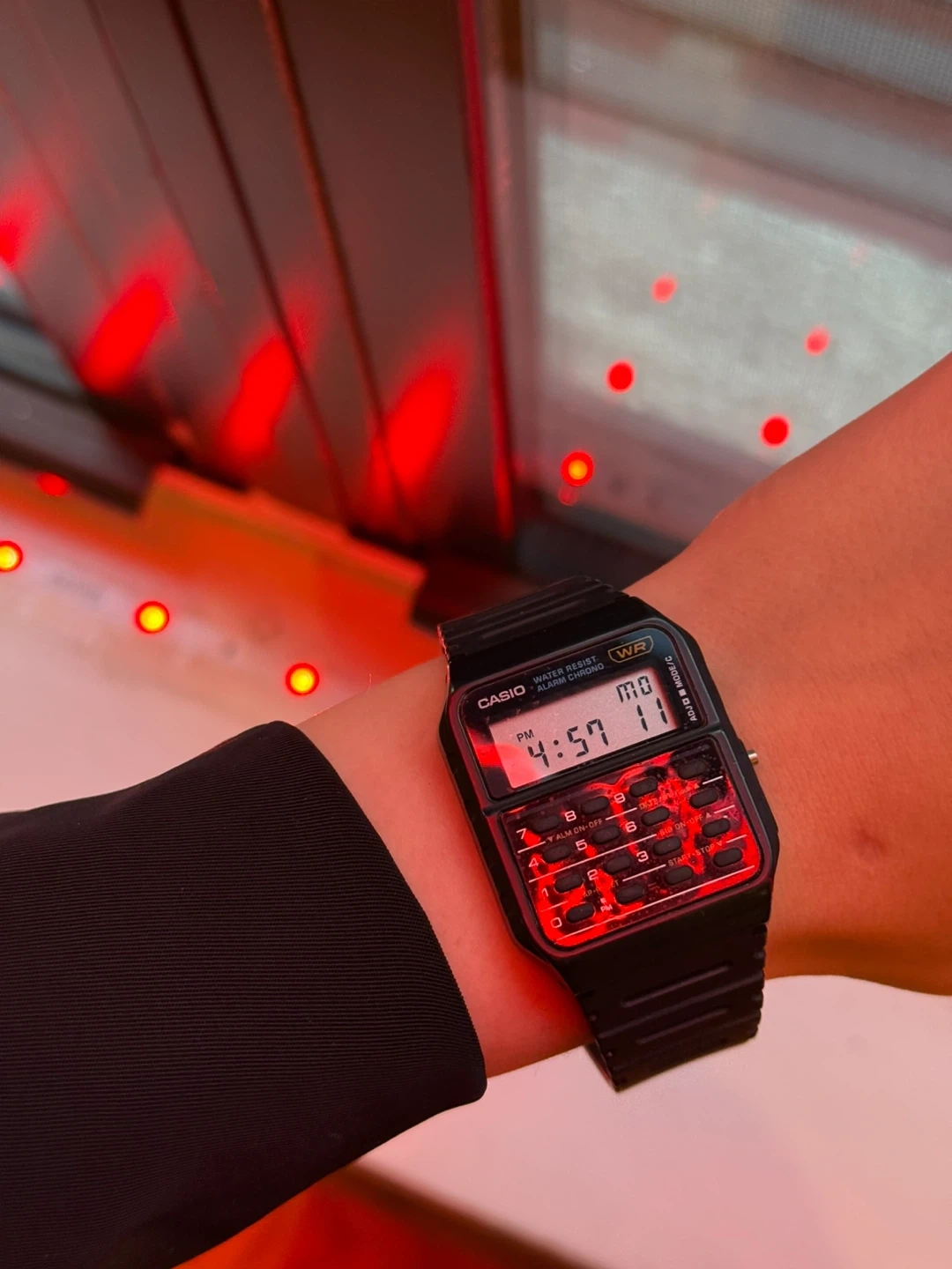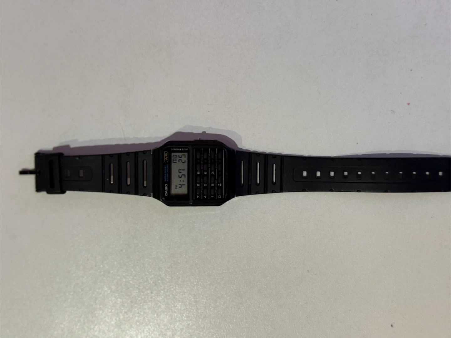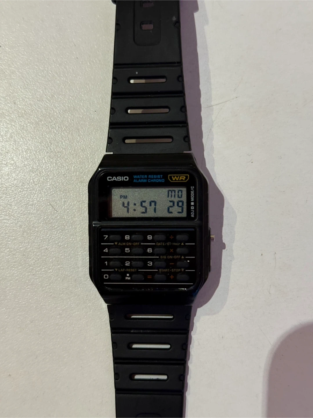 Black Casio calculator watch with alarm and chrono functions. It's water resistant and has a digital display. Includes date, time, and stopwatch capabilities. Condition is great!