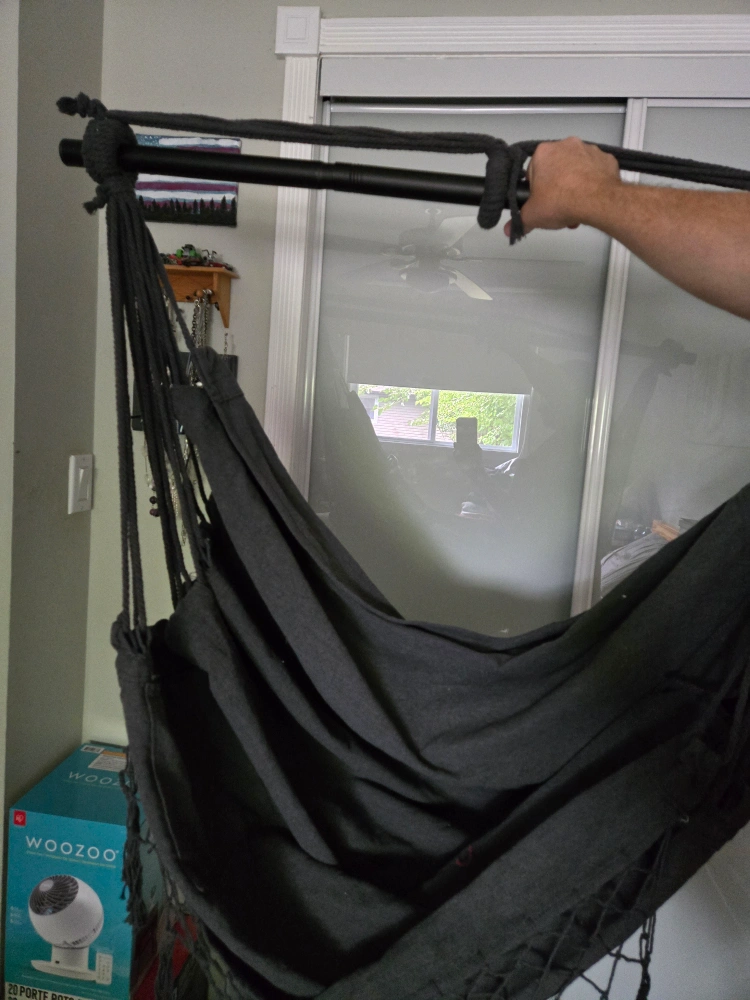 Selling a Woozoo hanging rope hammock chair. It's in great condition and ready to add a relaxing touch to your space! The dark grey colour is neutral and will fit in with any decor