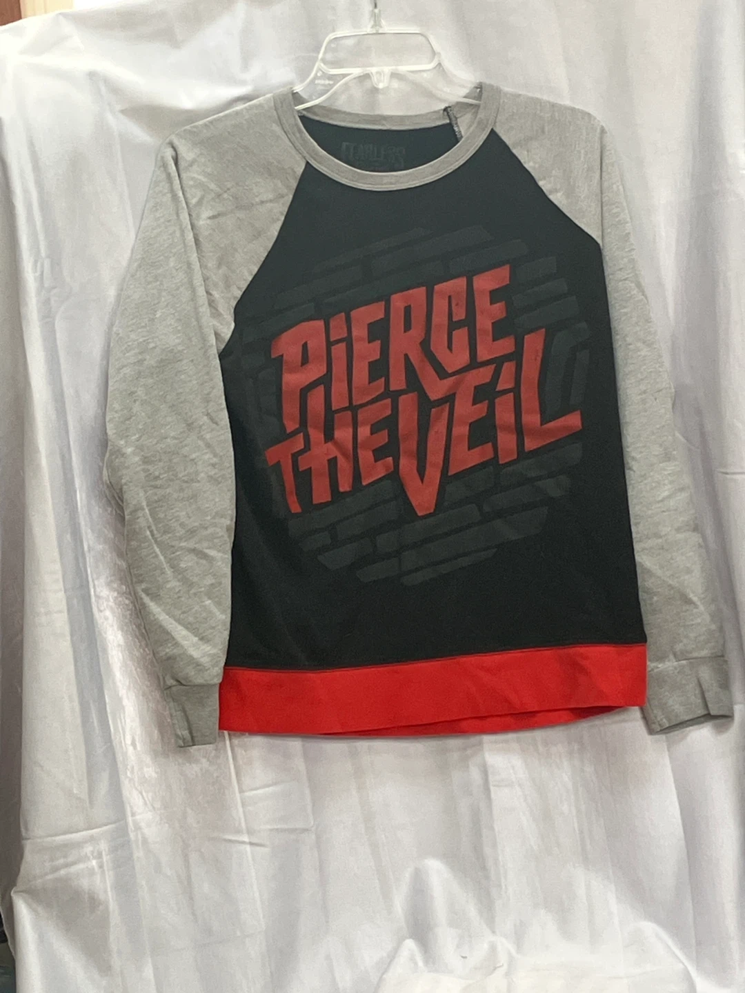 Grey and black long sleeve shirt with red accents. Features "Pierce The Veil" graphic on the front and "PTV" on the back. Likely a size medium based on the hanger and garment proportions, but no size tag is visible.