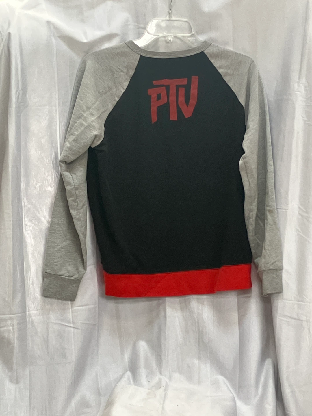 Grey and black long sleeve shirt with red accents. Features "Pierce The Veil" graphic on the front and "PTV" on the back. Likely a size medium based on the hanger and garment proportions, but no size tag is visible.