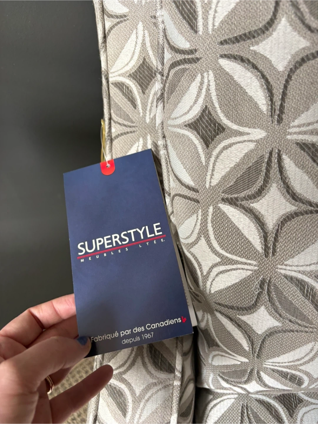 This Superstyle armchair features a custom patterned upholstery. Made in Canada from a high quality brand.