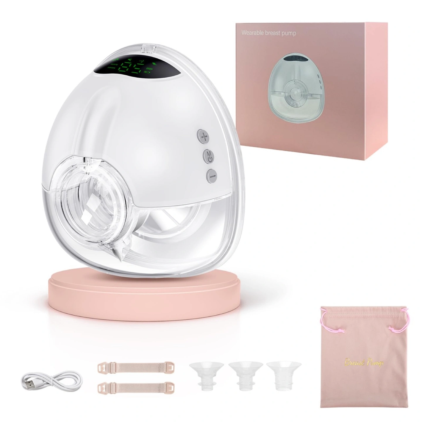 Electric breast pump. Food-grade silicone. BPA free. Skin friendly. Three flange sizes: 17mm, 19mm, 21mm. 180ml capacity. Four modes, nine levels. Includes USB charging cable, straps, and storage bag.