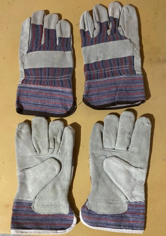 10• 2 pairs of Leather palm safety cuff gloves • Soft flexible wear for warehouse or landscaping • Highly abrasive split cowhide palm • Size Medium Asking $5 for both