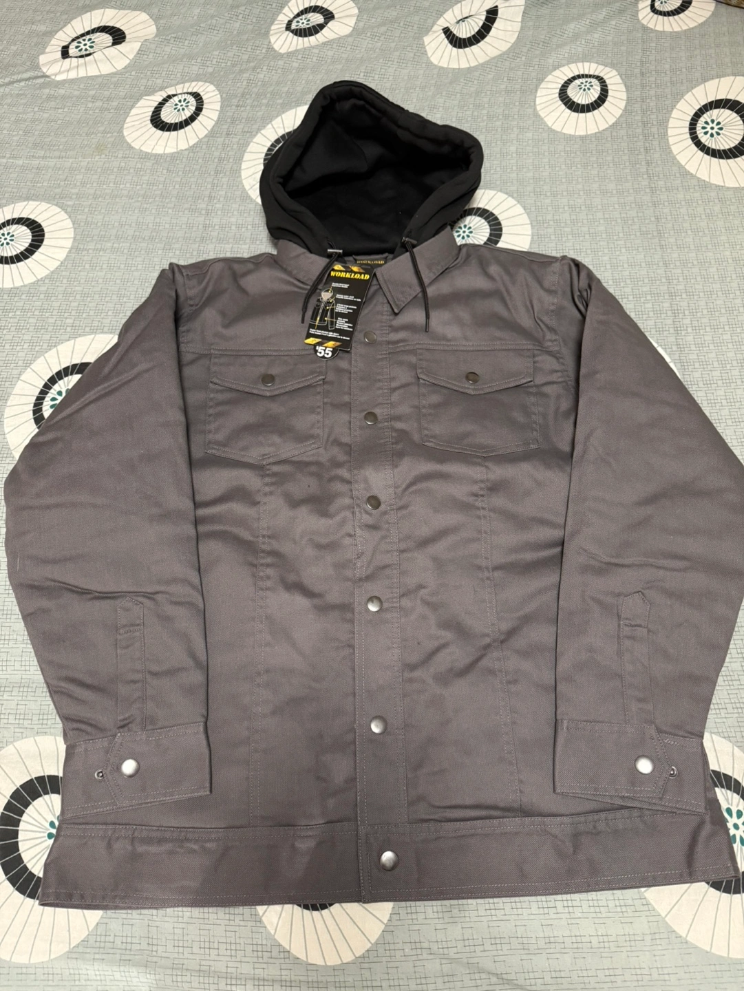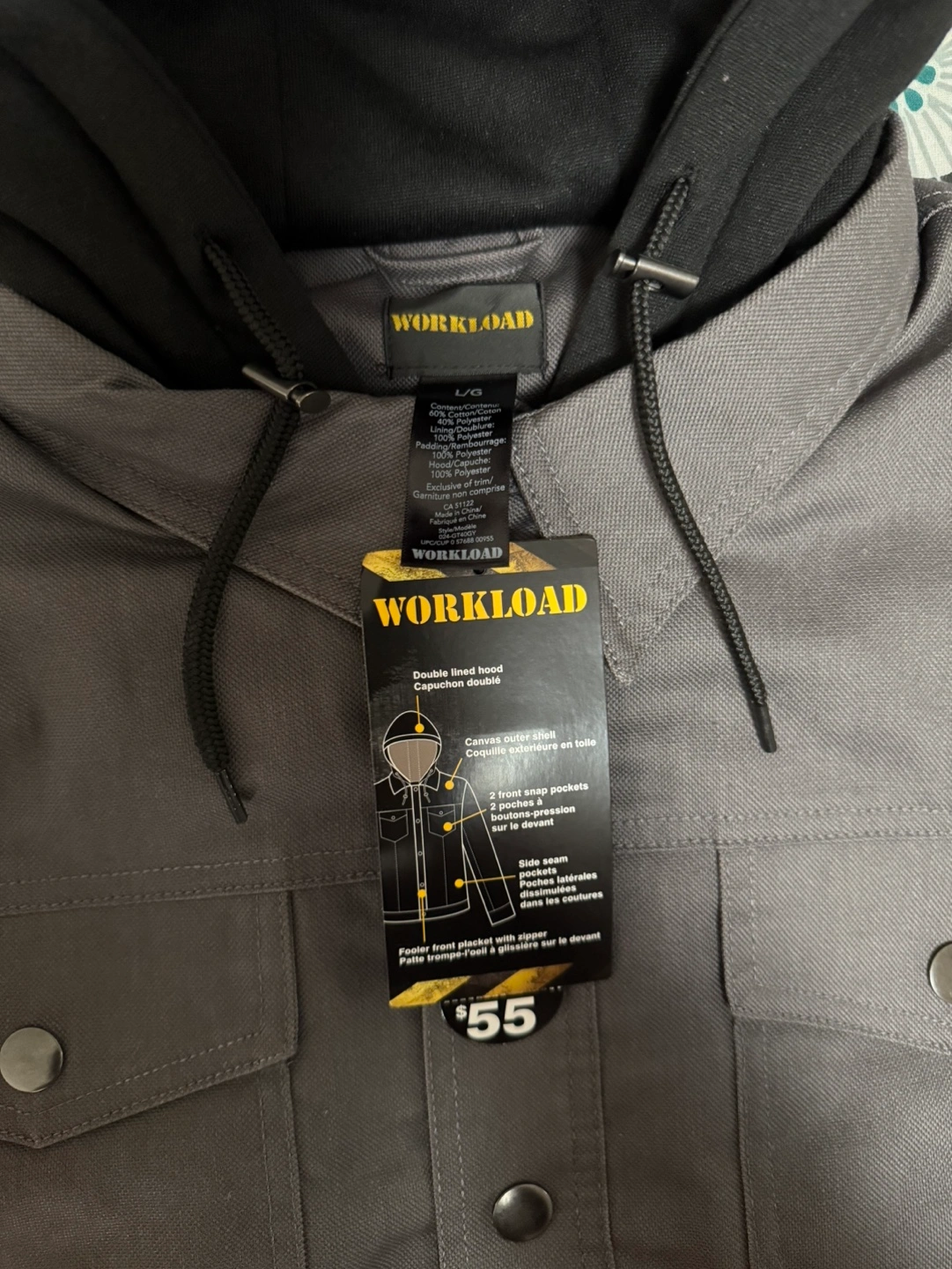 Brand new mems workload jacket in large size. Grey insulated hooded jacket. Double lined hood, canvas outer shell, two front flap pockets, side seam zipper pockets and a snap front placket. Original cost $55 selling for $35. Open to fair negotiation.