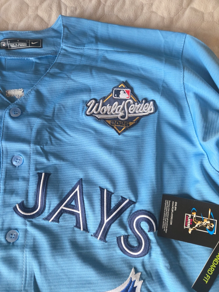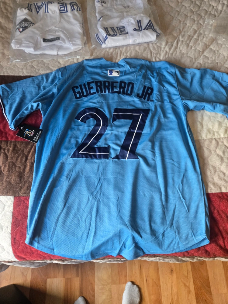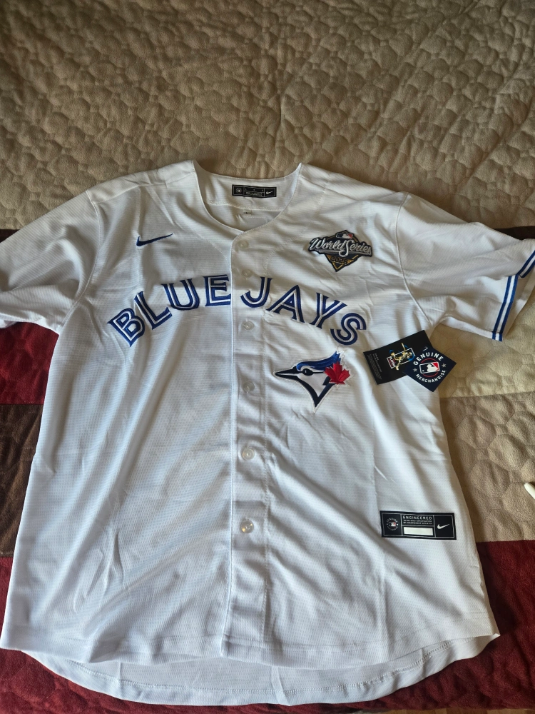 0Brand new Toronto Blue Jays World Series jerseys! Replica jerseys available and all three colors white, dark blue, baby blue. Two sizes available in both mens medium and large. Only have jerseys of George Springer and Vladimir Guerrero Jr. $85/jersey. Deals available if you buy multiples 2 for $150 3 for $120 Message me with any questions