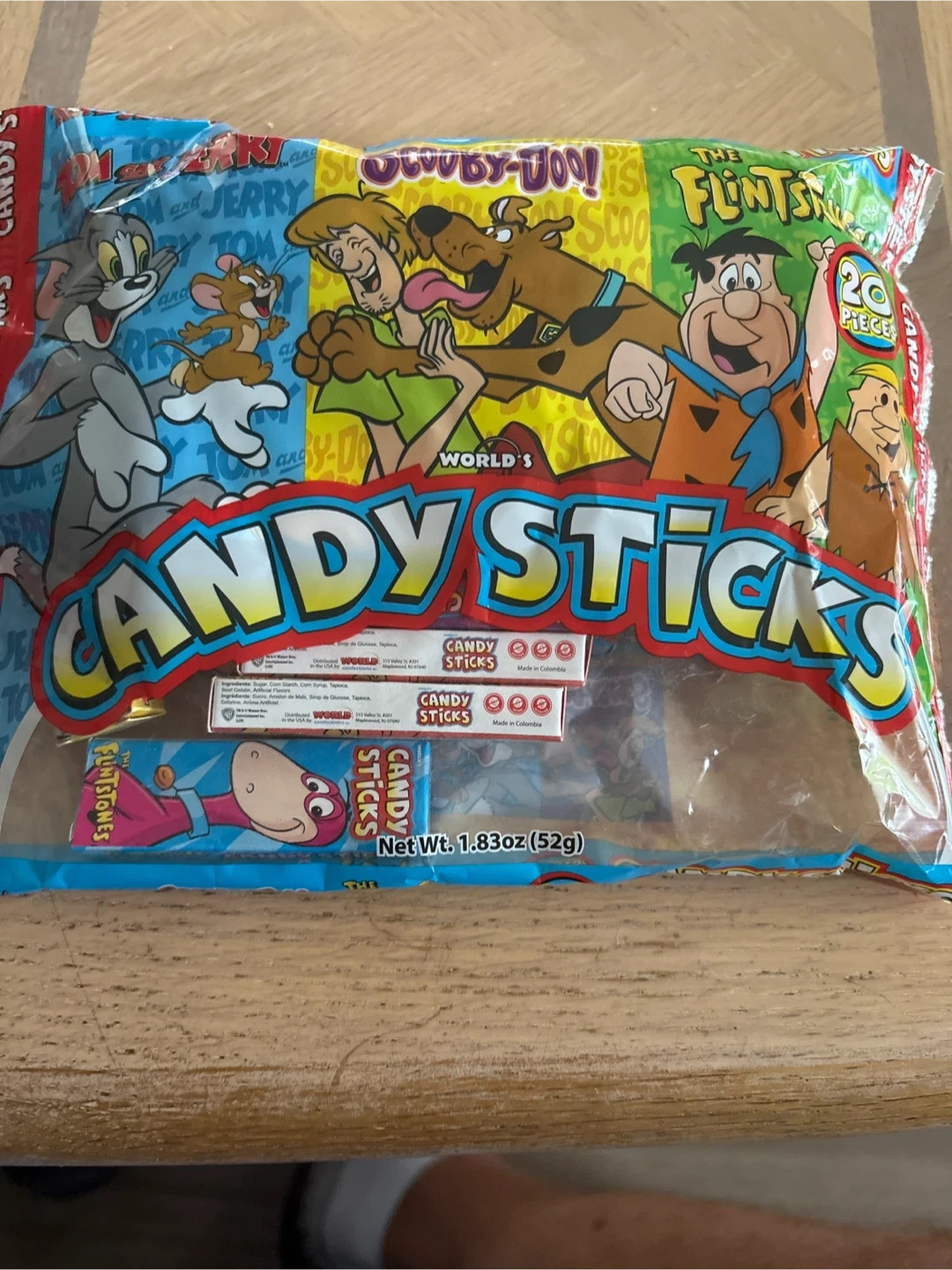 World's Candy Sticks featuring Scooby Doo, Tom & Jerry, and The Flintstones! Each bag contains 20 pieces of candy sticks. Net weight is 1.83oz (52g). They're also nut free! Expiry date is March 2028