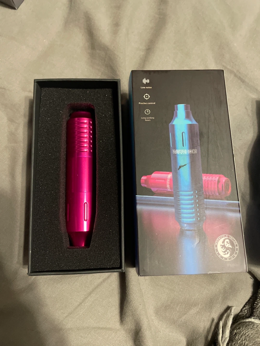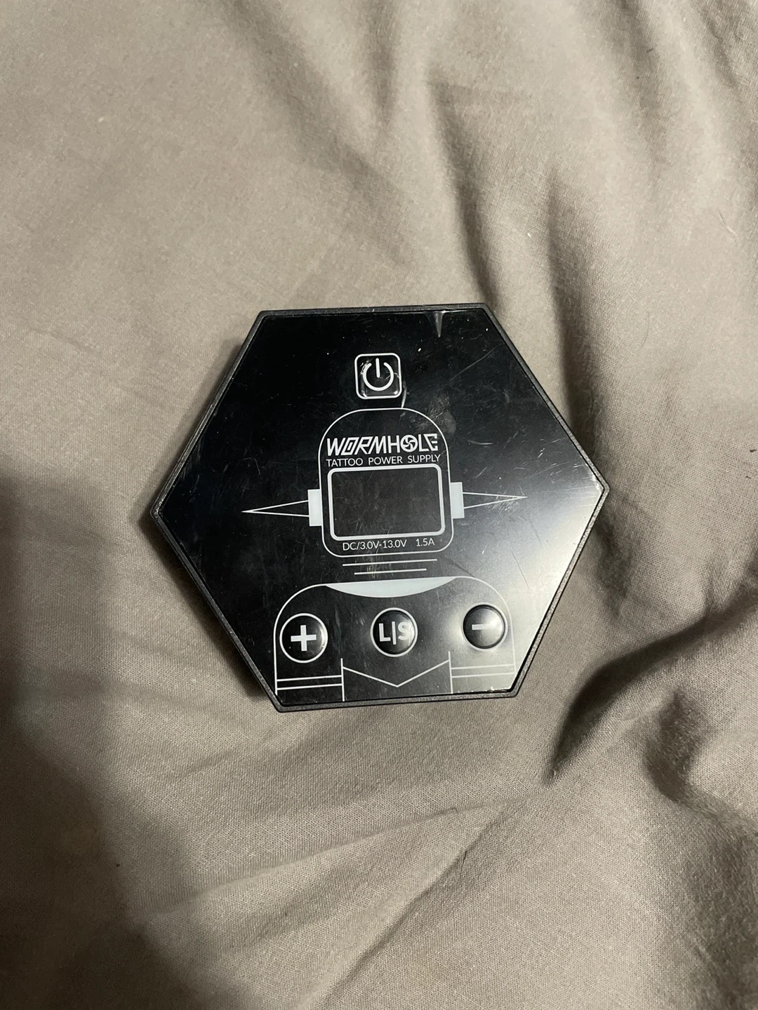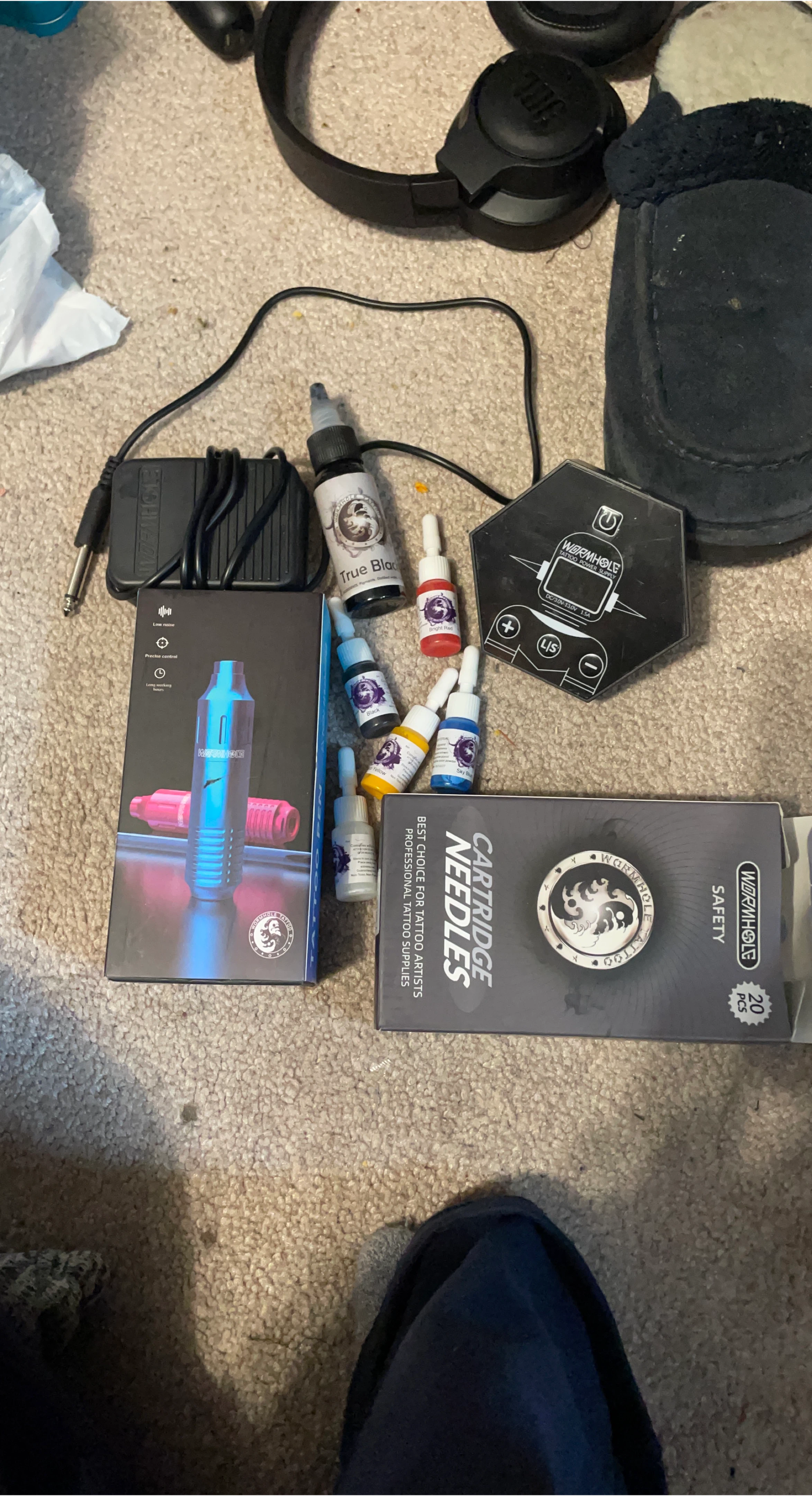 15Selling a Wormhole tattoo kit that includes a variety of items for tattooing. The kit features a tattoo pen, cartridge needles single and shading, a power supply, and several bottles of tattoo ink in different colours like True Black, Sky Blue, Deep Yellow, and Bright Red. Big bottle of black comes with ink caps one piece of fake skin and a pair of gloves all wires only used 4 times, CASH ONLY