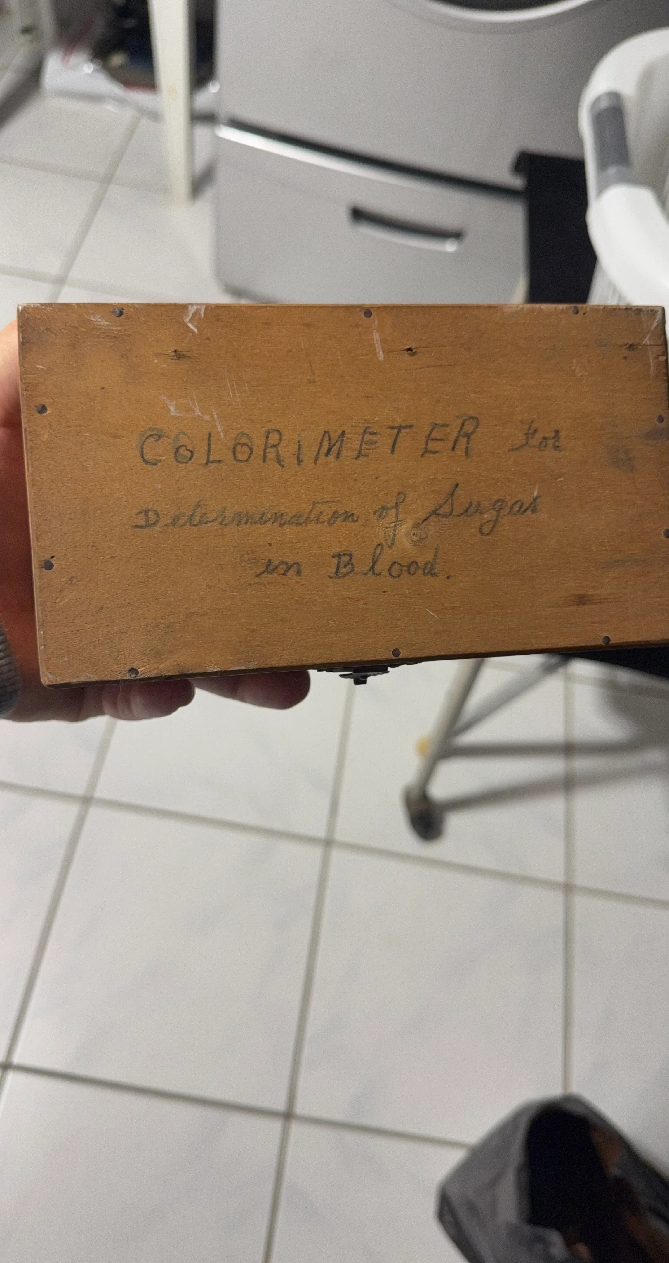 This is a vintage colorimeter used for the determination of sugar in blood. It's housed in a wooden box with a latch closure. This tool would be useful for anyone interested in historical medical equipment or as a display piece.