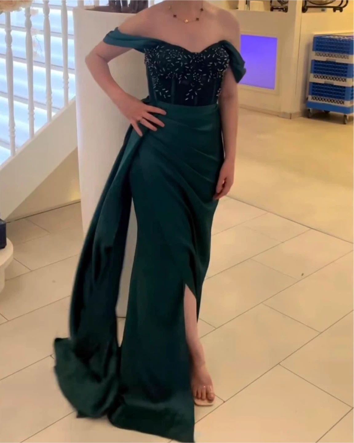 Elegant emerald green off-the-shoulder evening gown. It features a beaded bodice with a sweetheart neckline and a dramatic skirt with a high slit and train. Perfect for formal events and galas!