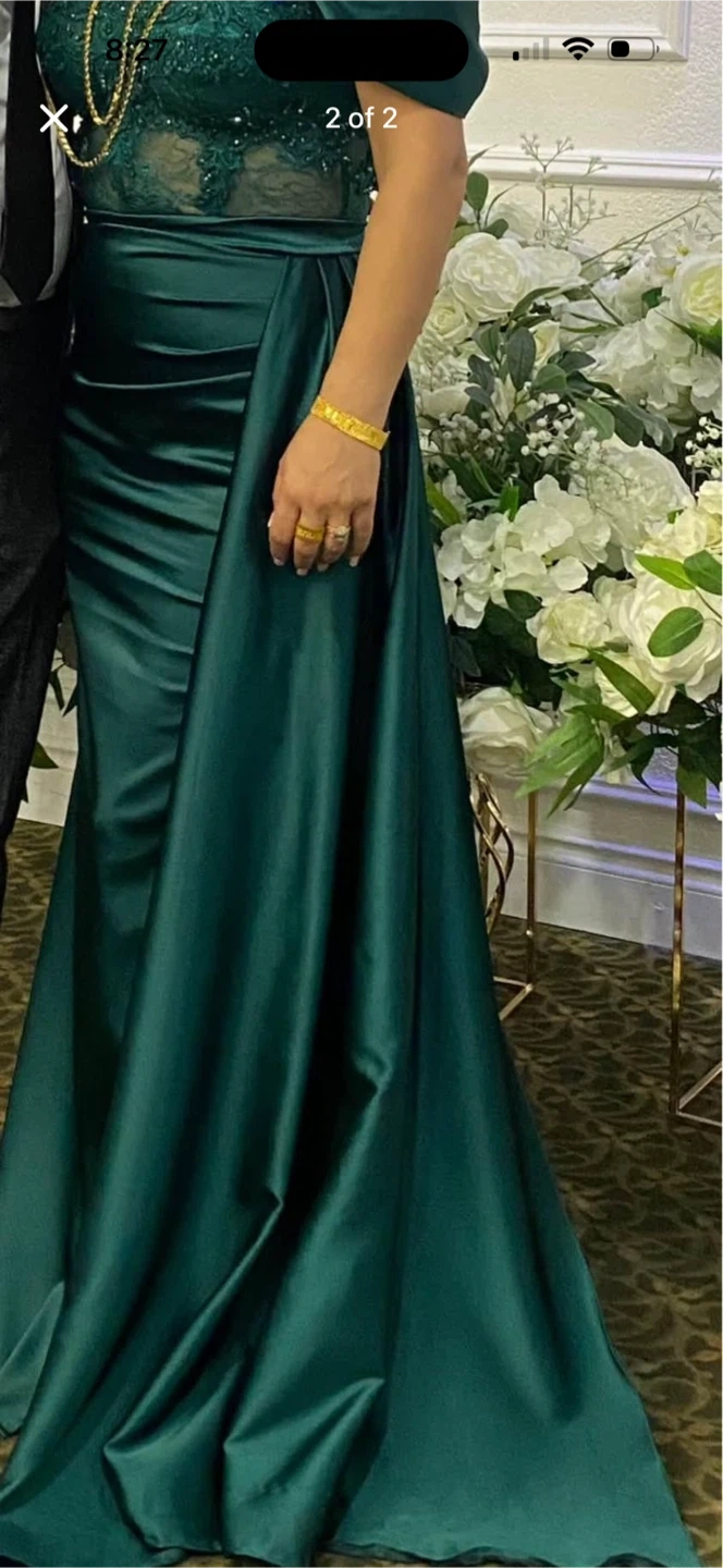 Elegant emerald green off-the-shoulder evening gown. It features a beaded bodice with a sweetheart neckline and a dramatic skirt with a high slit and train. Perfect for formal events and galas!