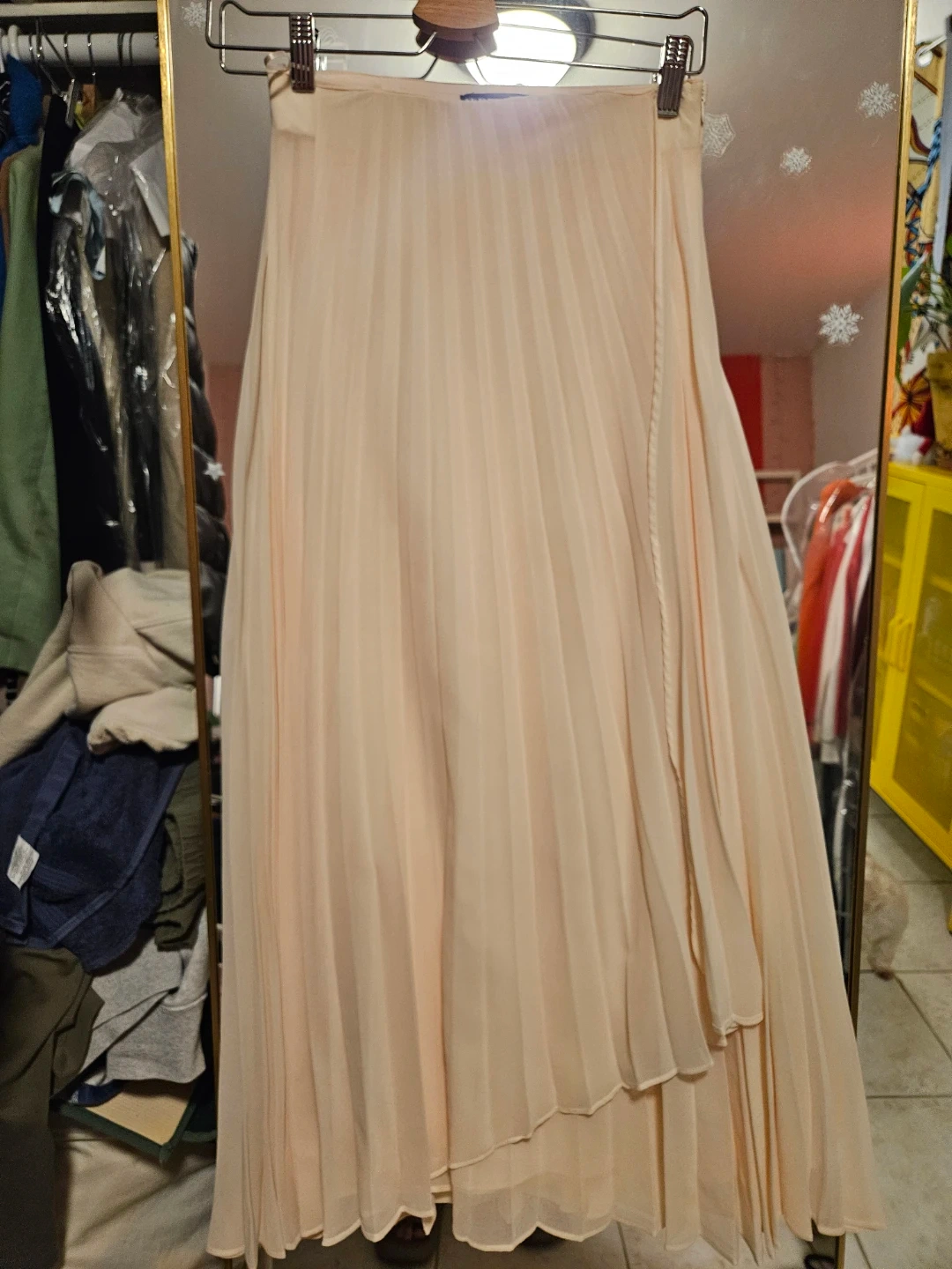 Selling a beautiful Zara pleated skirt in size XS! It's a lovely, flowy skirt that's perfect for any occasion. The color is a soft, neutral shade that goes with everything. It's in great condition and ready for a new home!