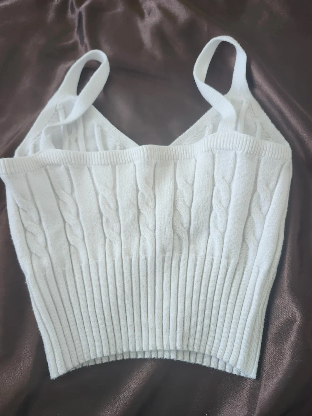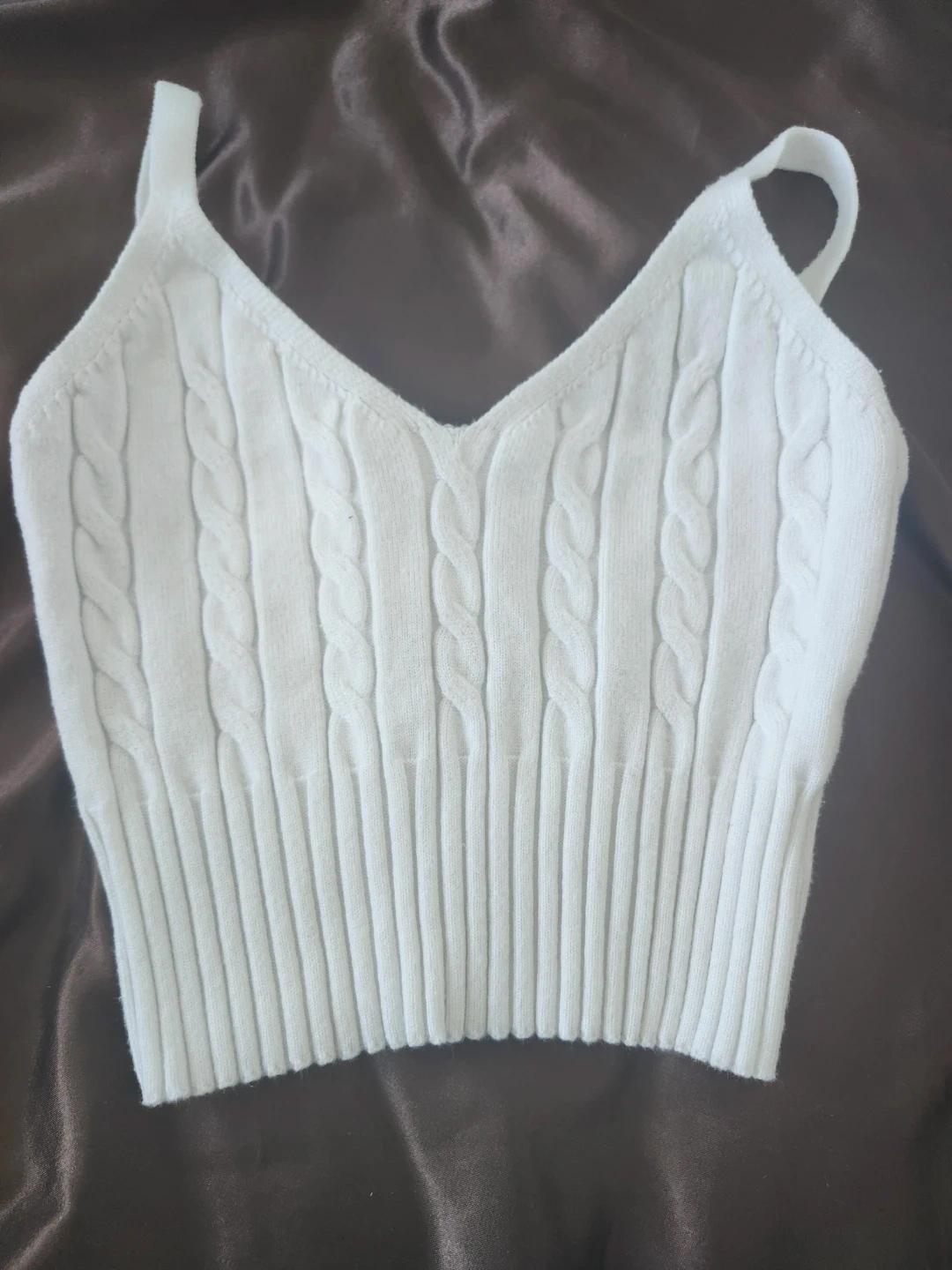 White cable knit cropped tank top with a V-neck. It's made of a stretchy knit material and features a ribbed hem. This top is great for layering or wearing on its own during warmer weather.
