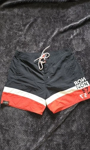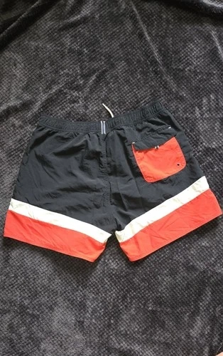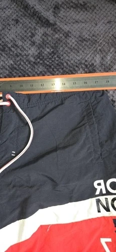 Authentic Helly Hansen board shorts. Featuring a nautical-inspired colorblock design, these shorts offer a durable yet lightweight feel, perfect for water sports or casual summer wear. Design: Contrast red back pocket with drain hole and velcro closure. Fit: Elasticated waistband with adjustable drawstring for a secure fit. Material: High-quality 100% Polyamide shell with a 100% Polyester mesh lining for quick-dry performance. Details: Embroidered "NOR" (Norway) graphics and "57" racing-style numbering on the leg. Condition: Excellent pre-owned condition. No visible stains, rips, or fading. Measurements (Flat Lay): Waist: ~15.5" (Unstretched) Inseam: ~5" Total Outseam: ~15.5"