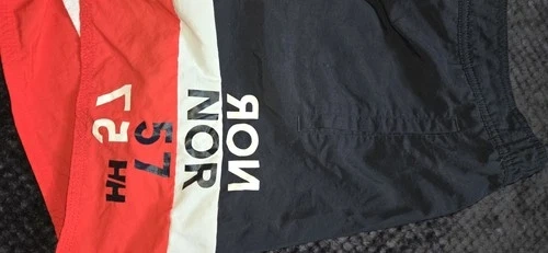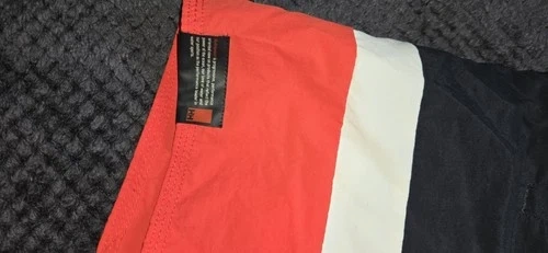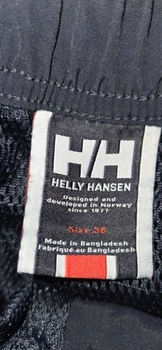 Authentic Helly Hansen board shorts. Featuring a nautical-inspired colorblock design, these shorts offer a durable yet lightweight feel, perfect for water sports or casual summer wear. Design: Contrast red back pocket with drain hole and velcro closure. Fit: Elasticated waistband with adjustable drawstring for a secure fit. Material: High-quality 100% Polyamide shell with a 100% Polyester mesh lining for quick-dry performance. Details: Embroidered "NOR" (Norway) graphics and "57" racing-style numbering on the leg. Condition: Excellent pre-owned condition. No visible stains, rips, or fading. Measurements (Flat Lay): Waist: ~15.5" (Unstretched) Inseam: ~5" Total Outseam: ~15.5"