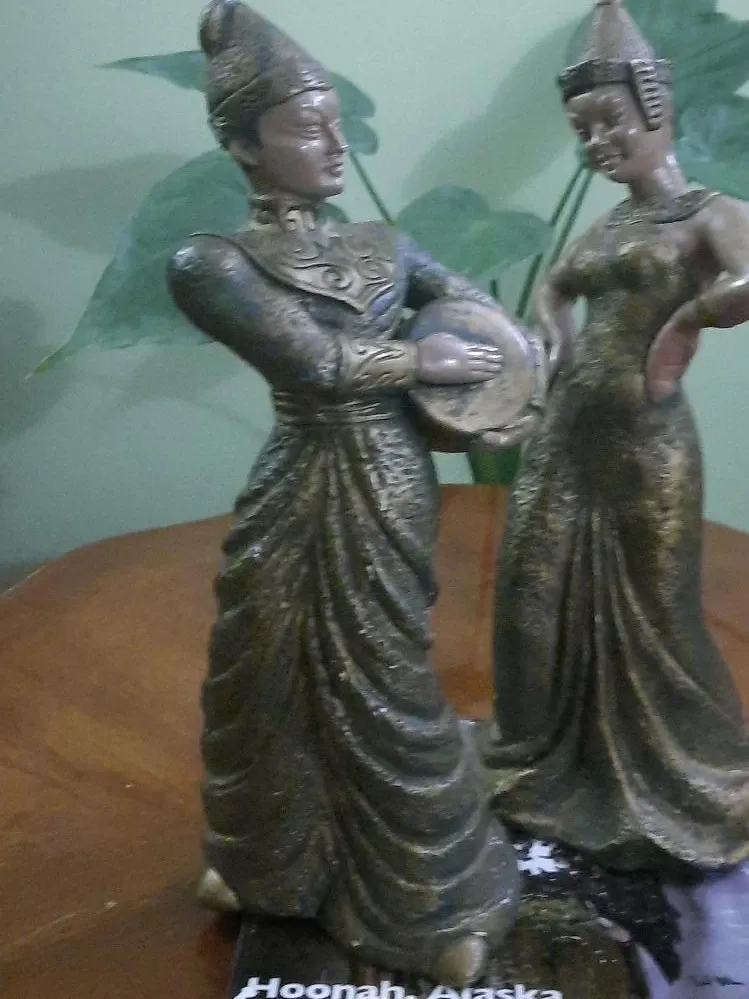 This set features two decorative figurines depicting people in traditional attire. The larger figurine holds a round object, possibly a drum. They appear to be made of a bronze-toned material. This piece could add a unique touch to your home decor.