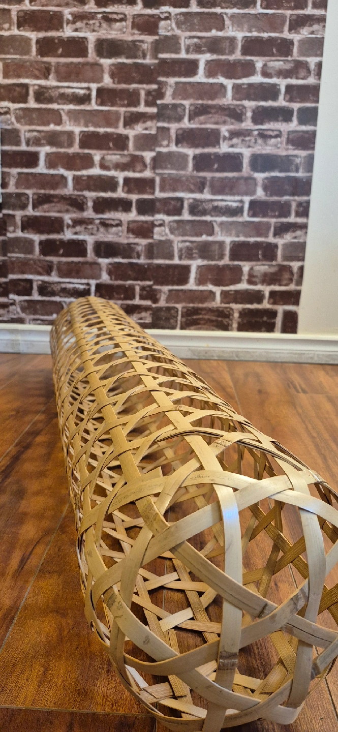 95This is a woven bamboo floor lamp shade. It's in great condition and would add a nice touch to any room. It has a natural, light wood colour. It's perfect for adding a warm and inviting glow to your living space