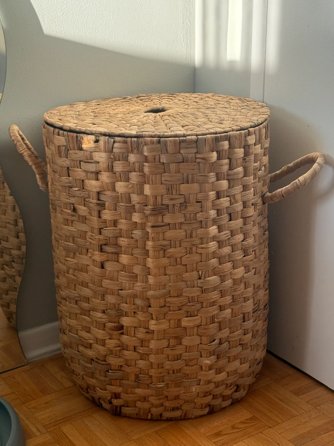 Selling a woven basket with a lid! It's in great condition and would be perfect for storage or laundry. It has handles on the side for easy moving around the house