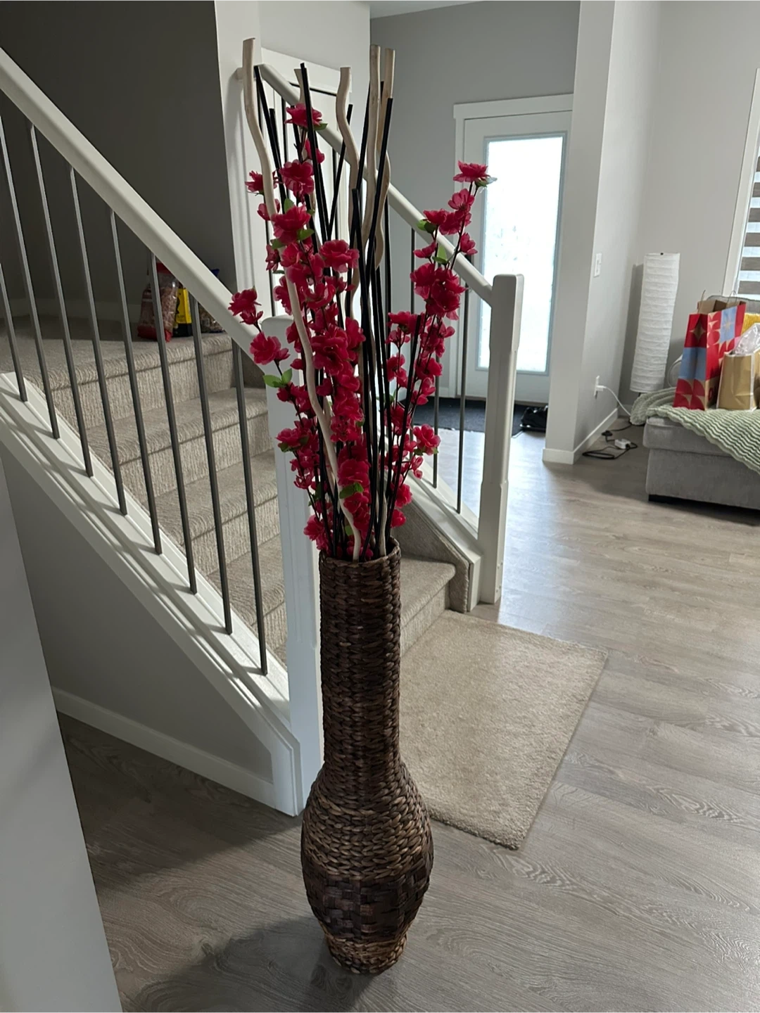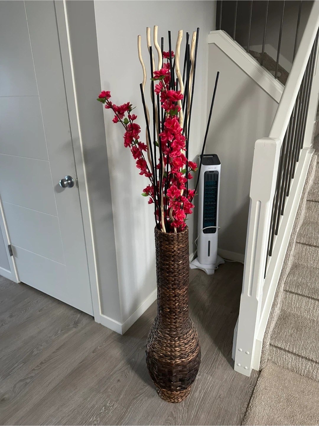 16Selling a beautiful woven floor vase with a floral arrangement! It's in great condition and would look lovely in any home. The vase has a unique texture and the flowers add a pop of colour