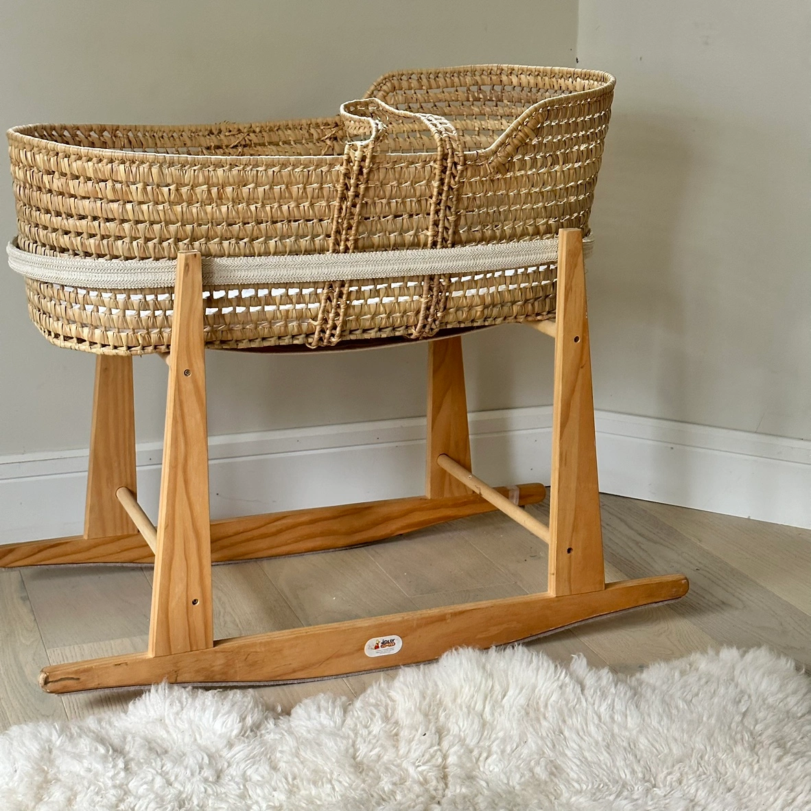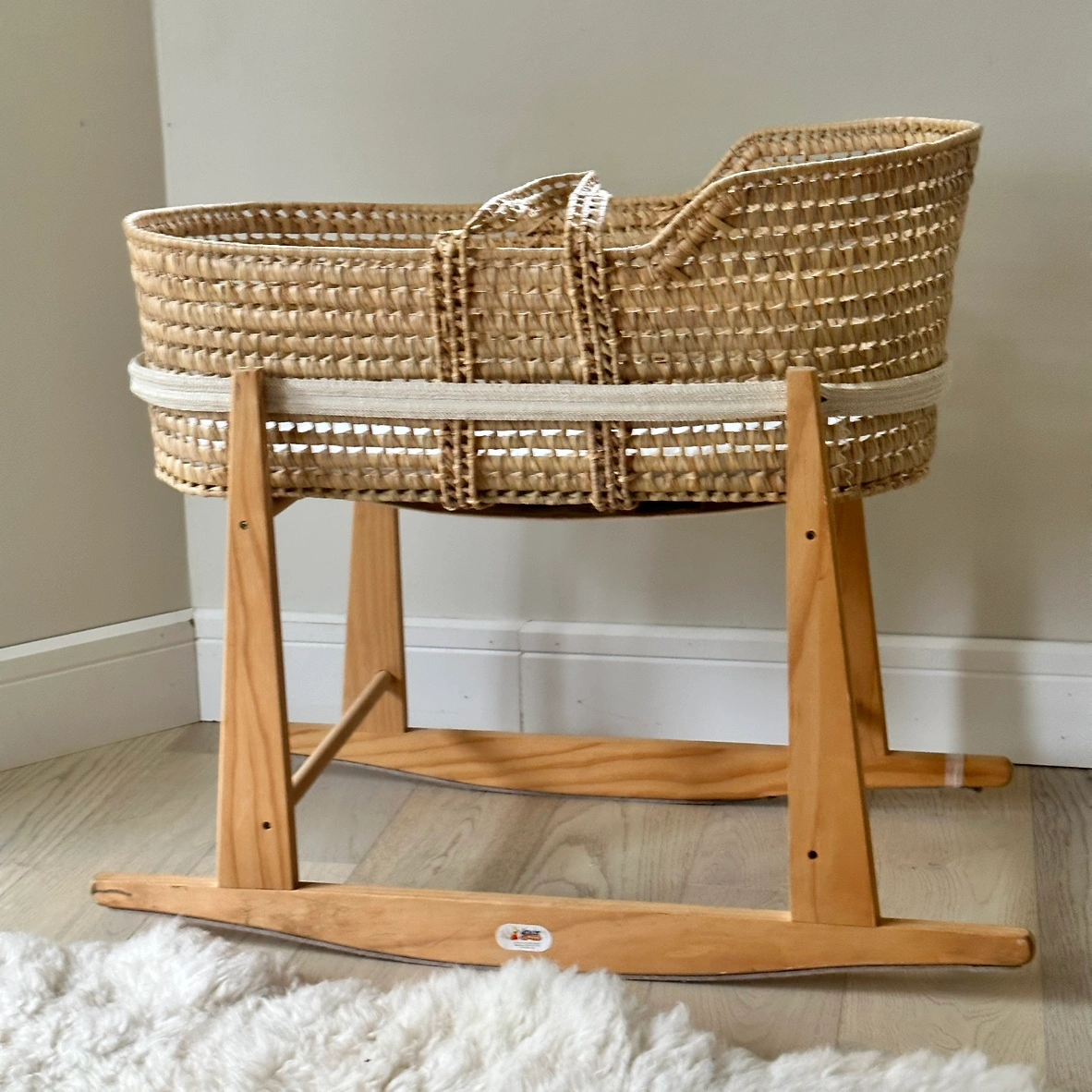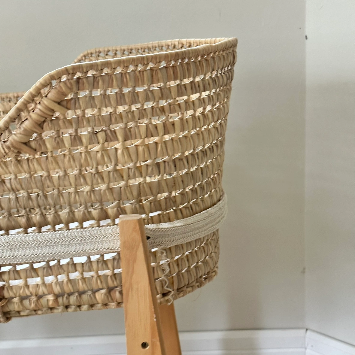 15A beautiful woven bassinet on a rocking wooden stand. The bassinet is made from natural materials and features a cream-coloured woven band. The stand is made of light-coloured wood. Pickup east kildonan