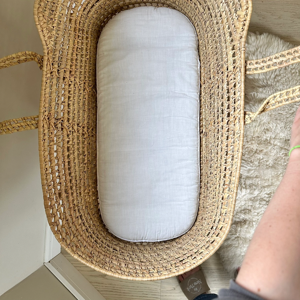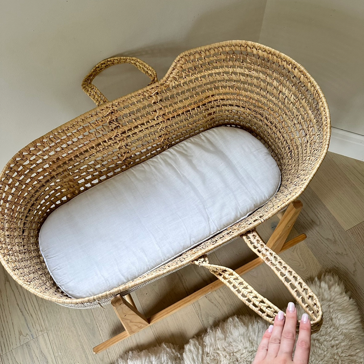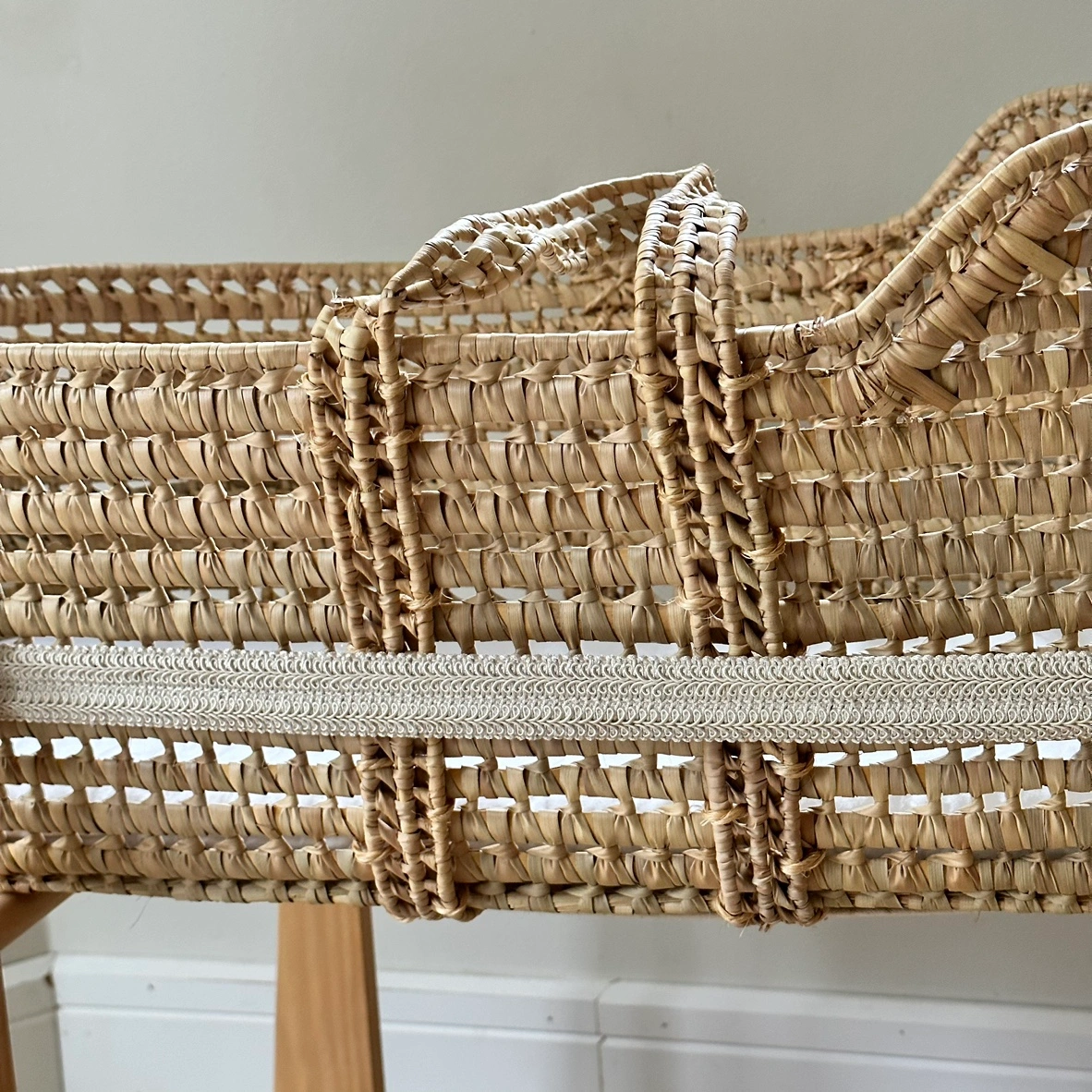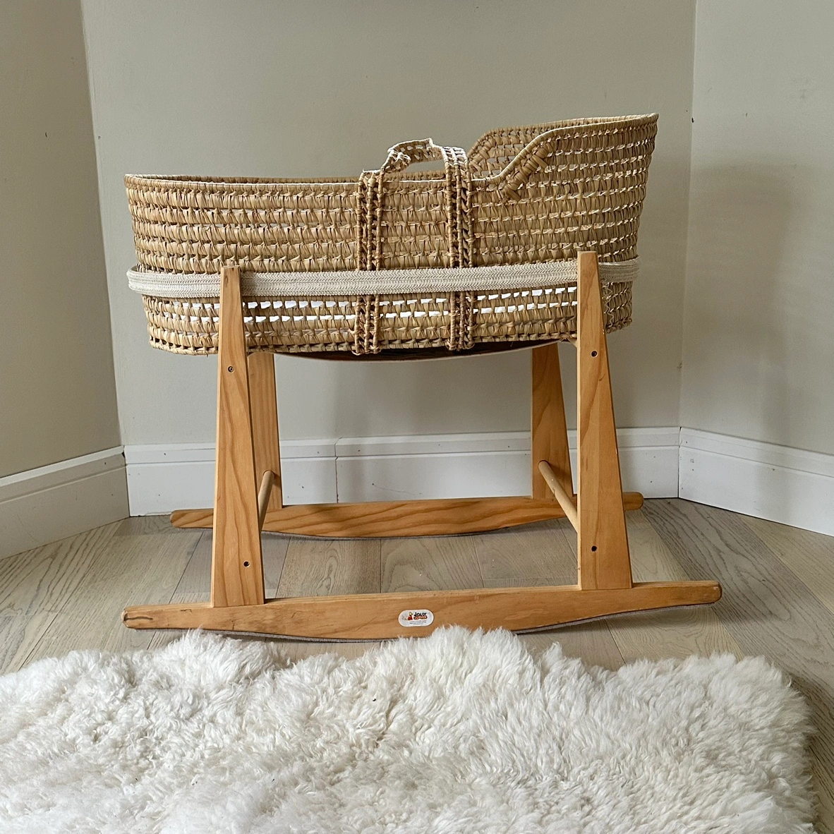 15A beautiful woven bassinet on a rocking wooden stand. The bassinet is made from natural materials and features a cream-coloured woven band. The stand is made of light-coloured wood. Pickup east kildonan