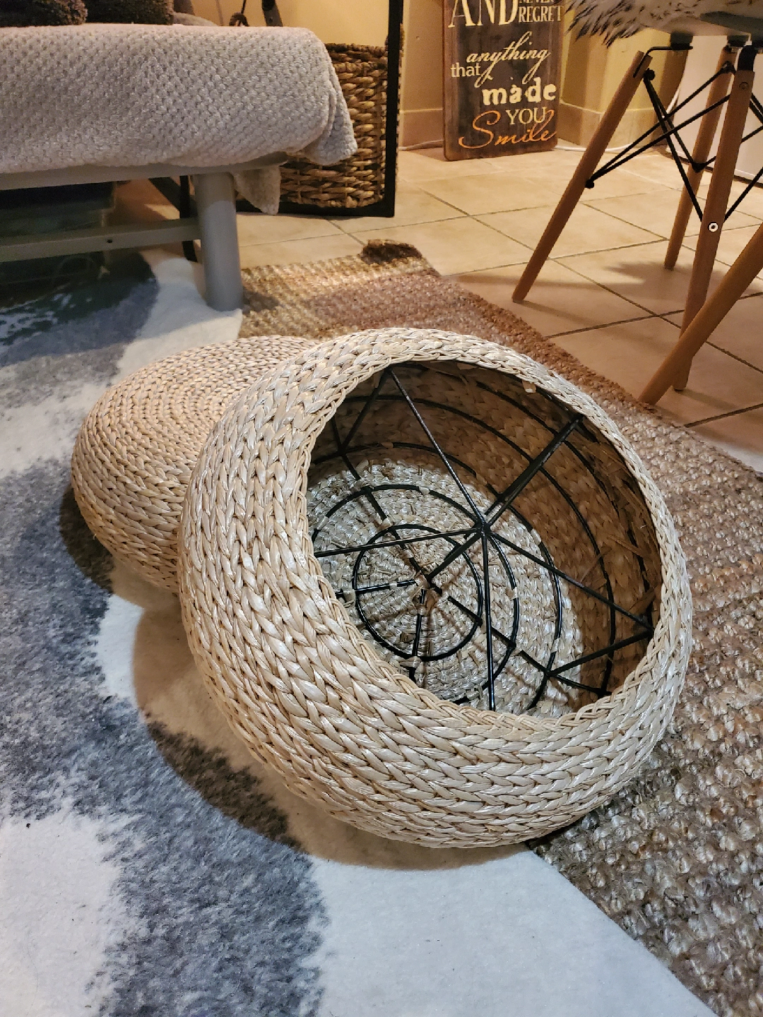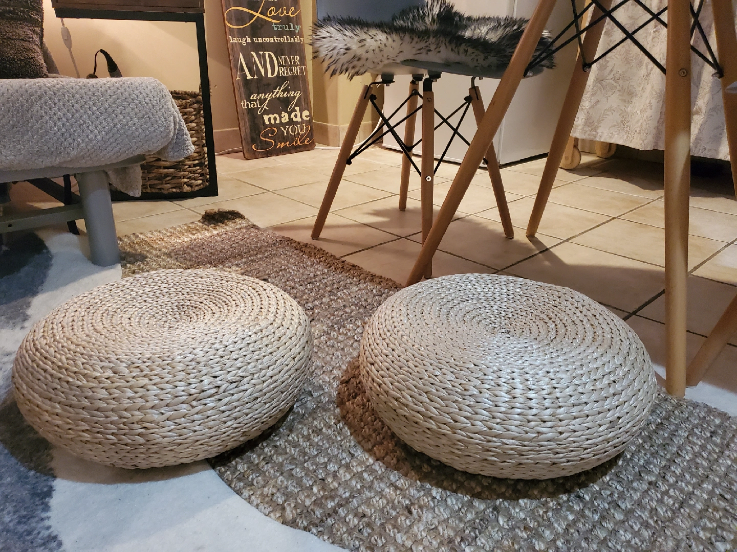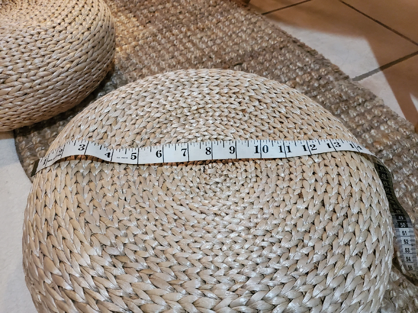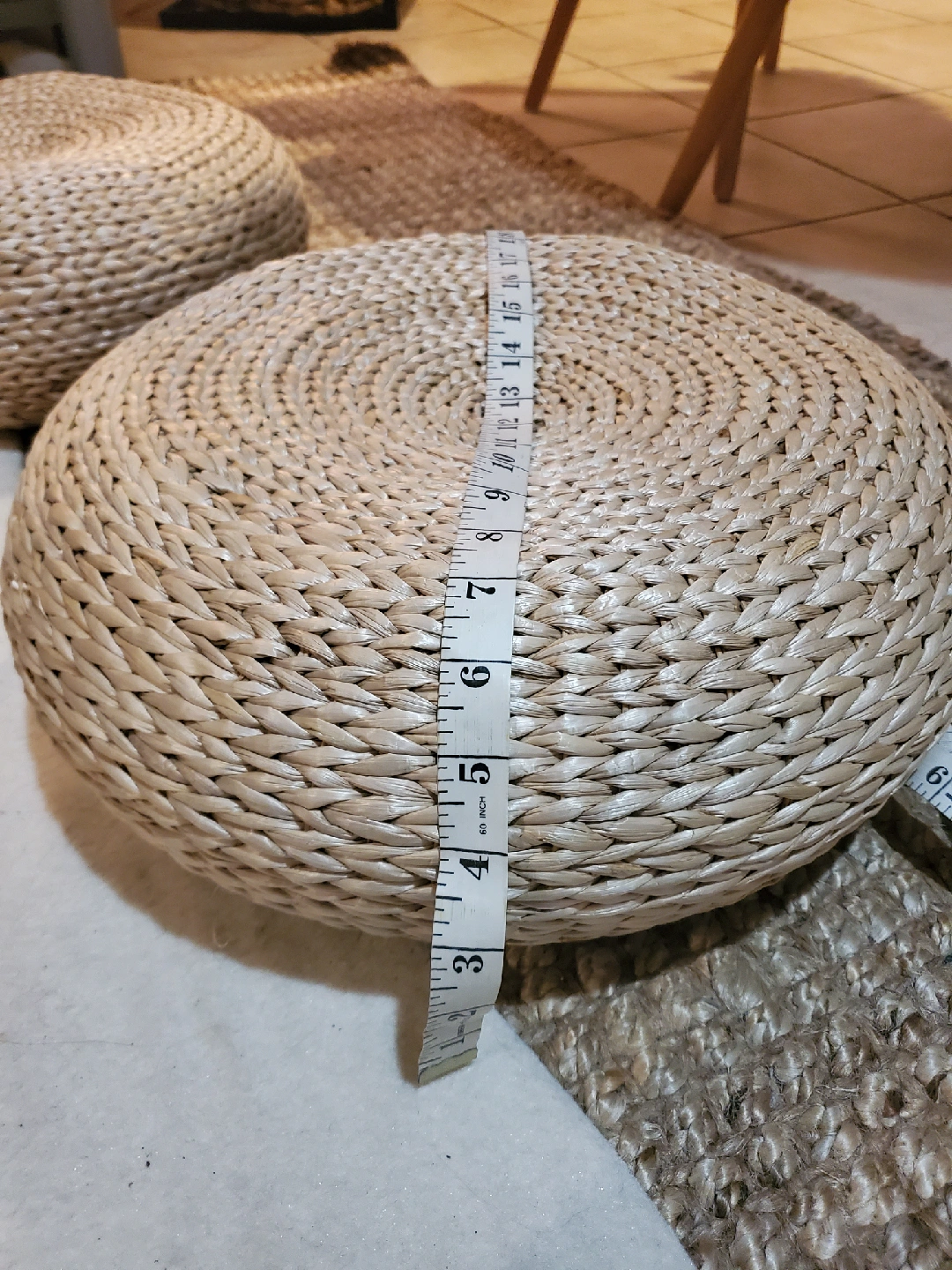 60Selling a set of woven rattan pouf super cute ottomans! They're in great shape, very sturdy and add a lovely natural touch to any room. Each pouf measures approximately 16 inches in diameter and 6 inches height and could be used as extra seating by a coffee table