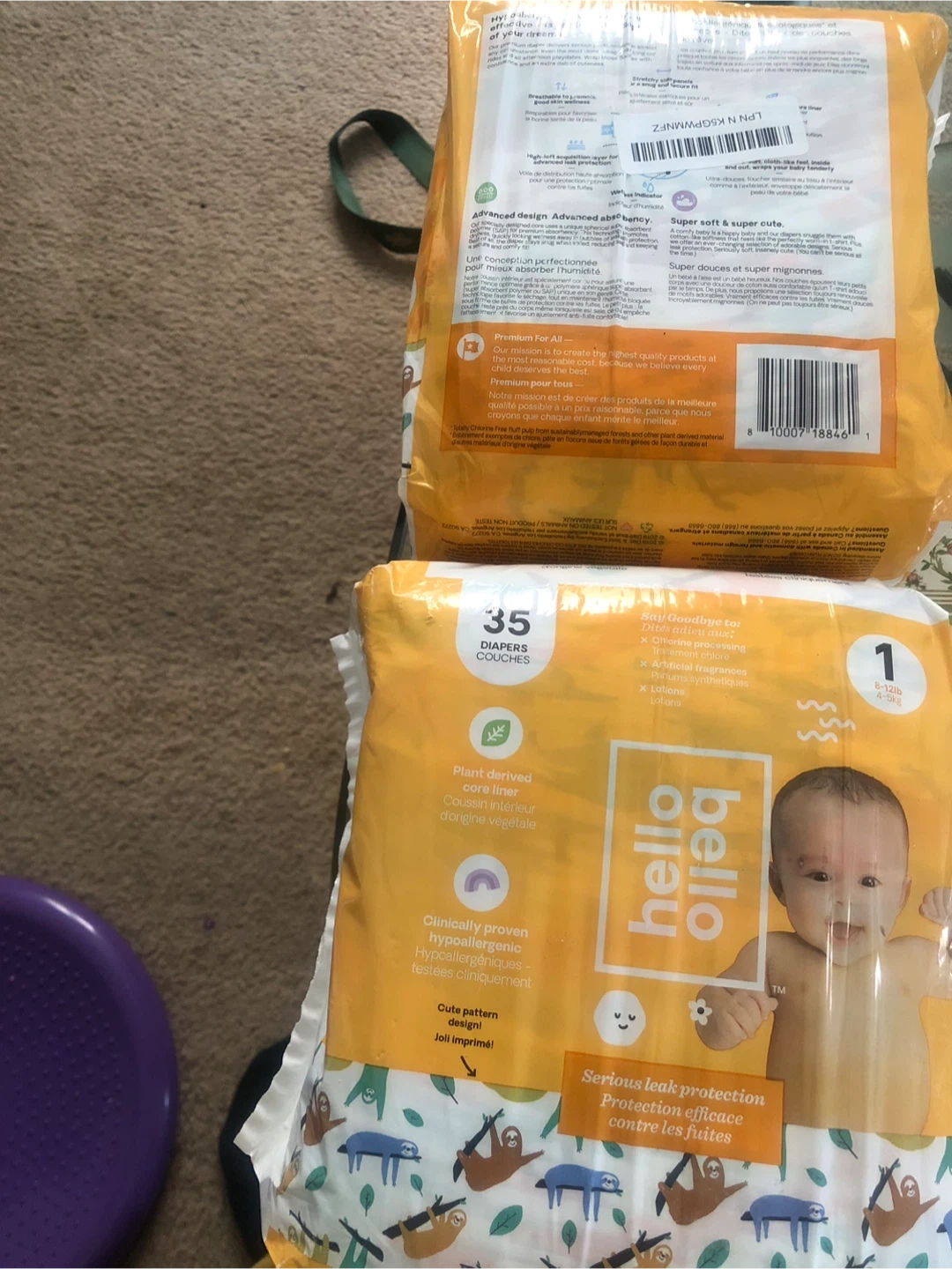 Hello Bello diapers, size 1. These come in a pack of 35 and are suitable for babies weighing 8-12lbs (4-5kg). They're made with plant-derived, hypoallergenic materials for sensitive skin. Serious leak protection is provided!