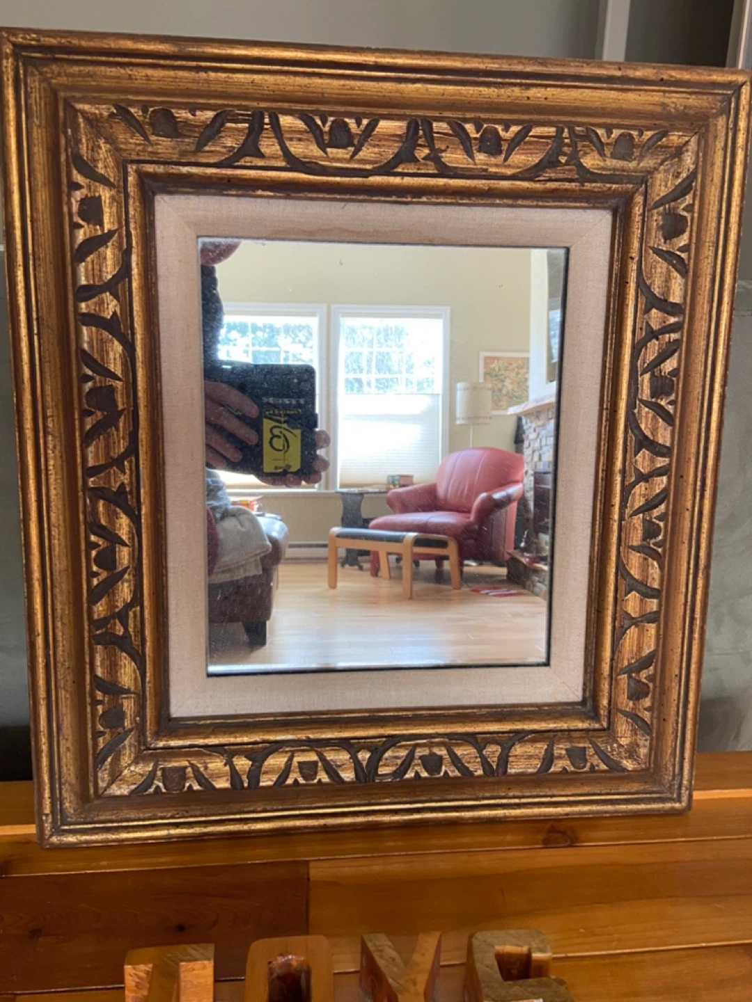 This decorative mirror features an ornate gold frame with a textured linen matting. It's perfect for adding a touch of elegance to any room. The frame has intricate carved detailing.