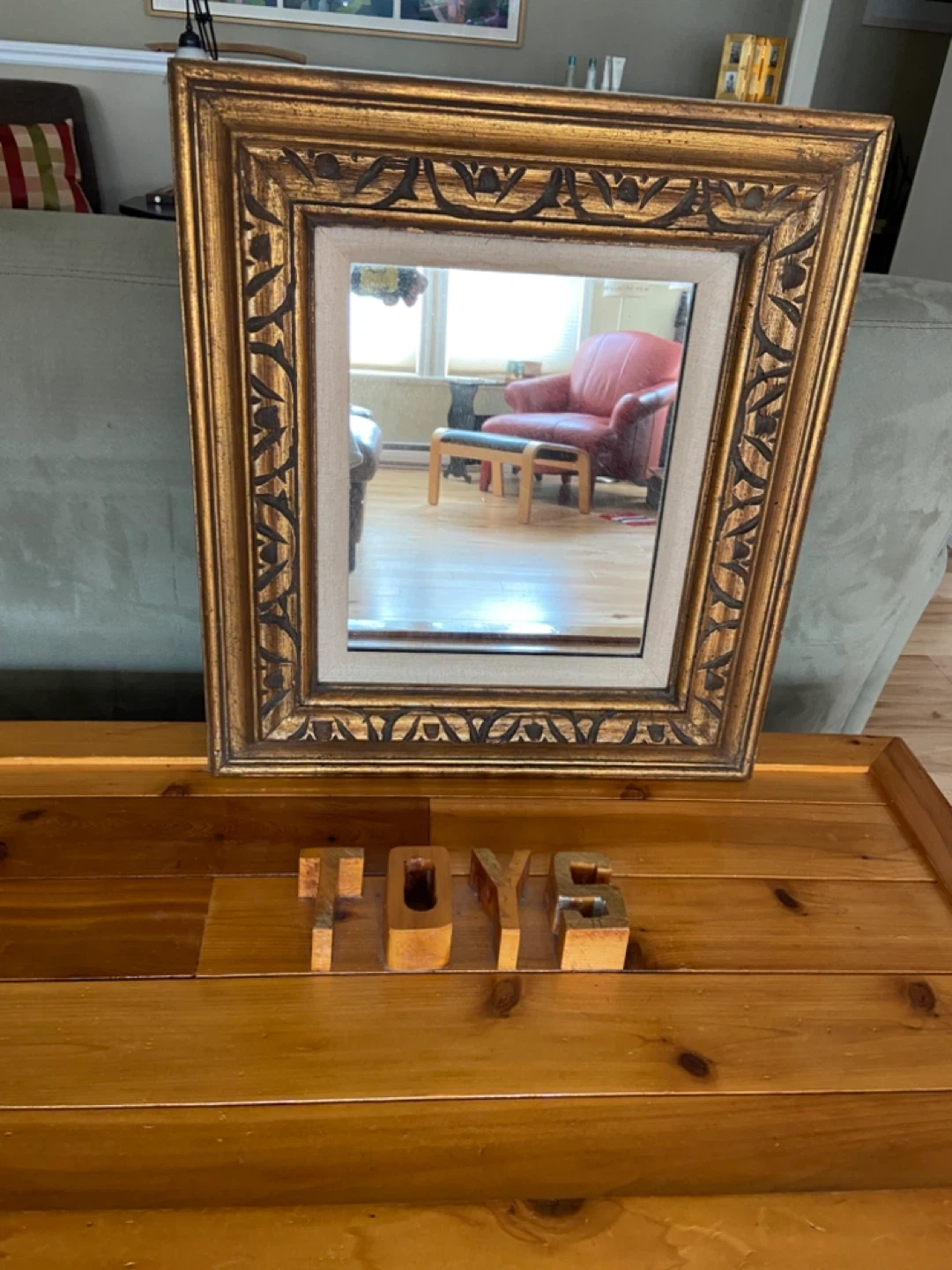 This decorative mirror features an ornate gold frame with a textured linen matting. It's perfect for adding a touch of elegance to any room. The frame has intricate carved detailing.