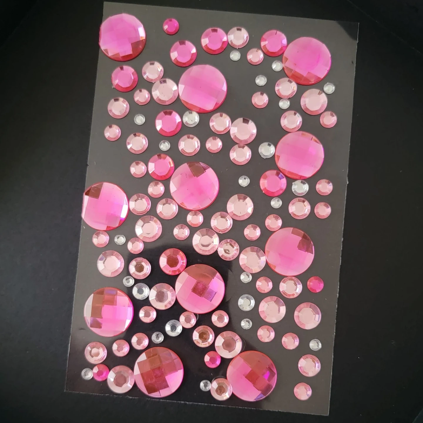 All three - A collection of self-adhesive rhinestones and pearl embellishments for crafting and decorating. Includes pink and clear rhinestones in various sizes, as well as white pearls. Great for adding sparkle to costumes, cards, or accessories!