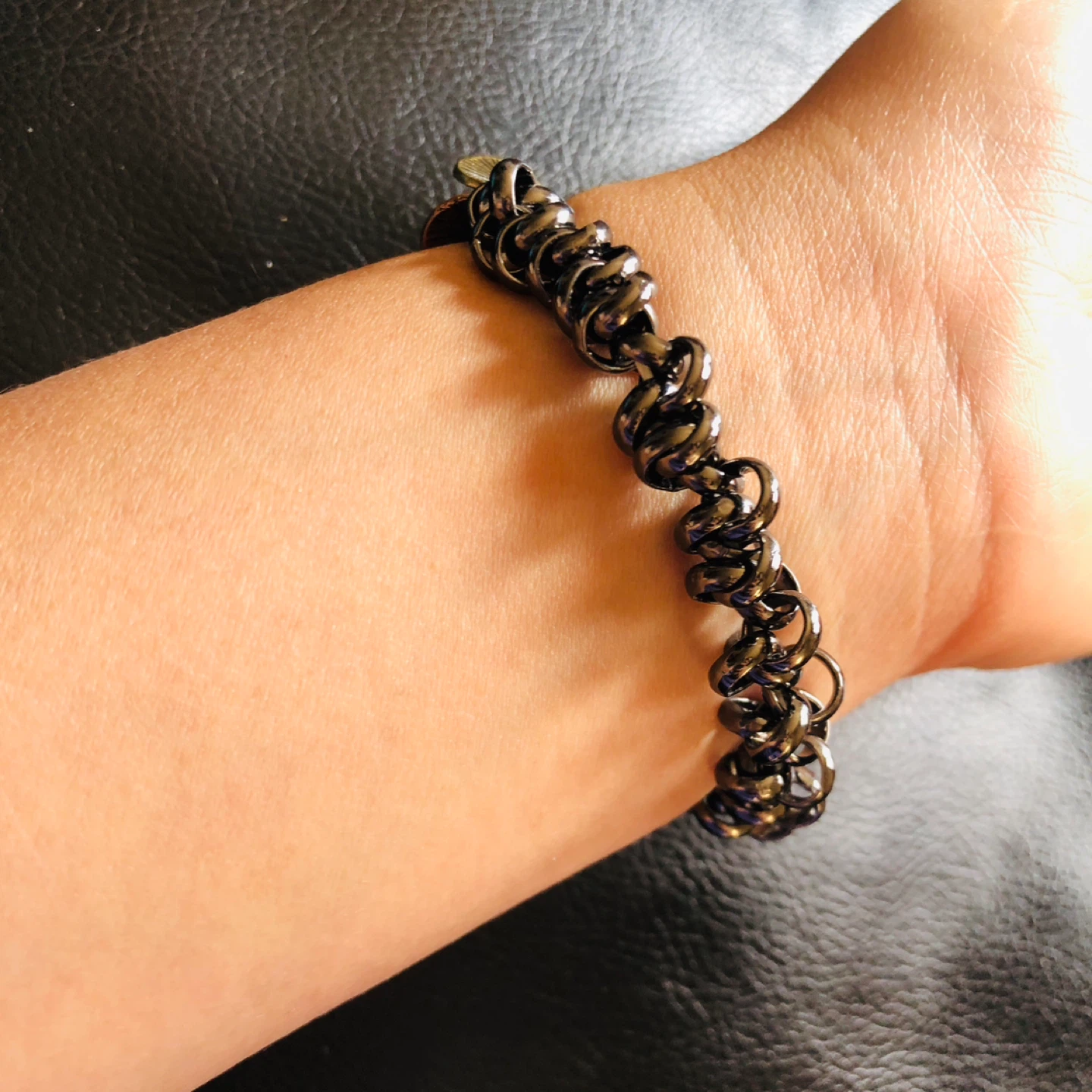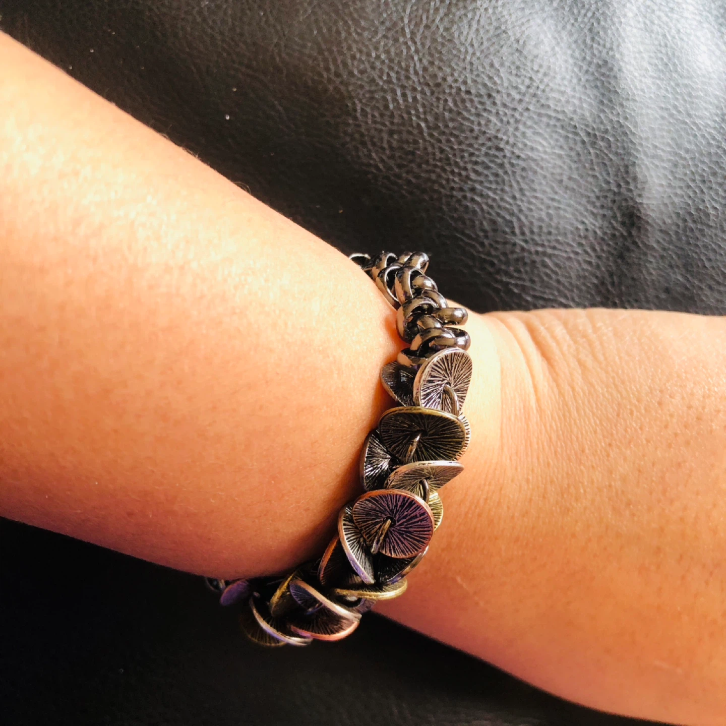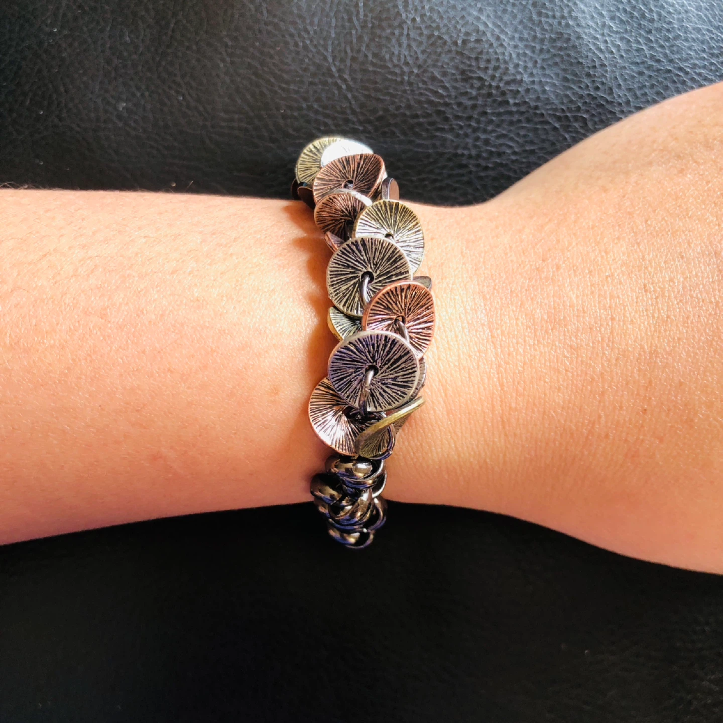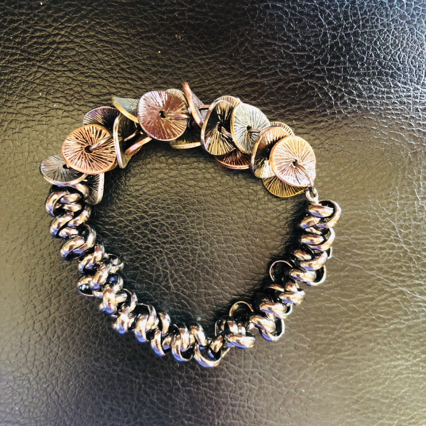 This bracelet features a unique design with woven chain and decorative disk charms. Its mixed-metal finish adds a touch of visual interest. Offers a stylish accent for any outfit!
