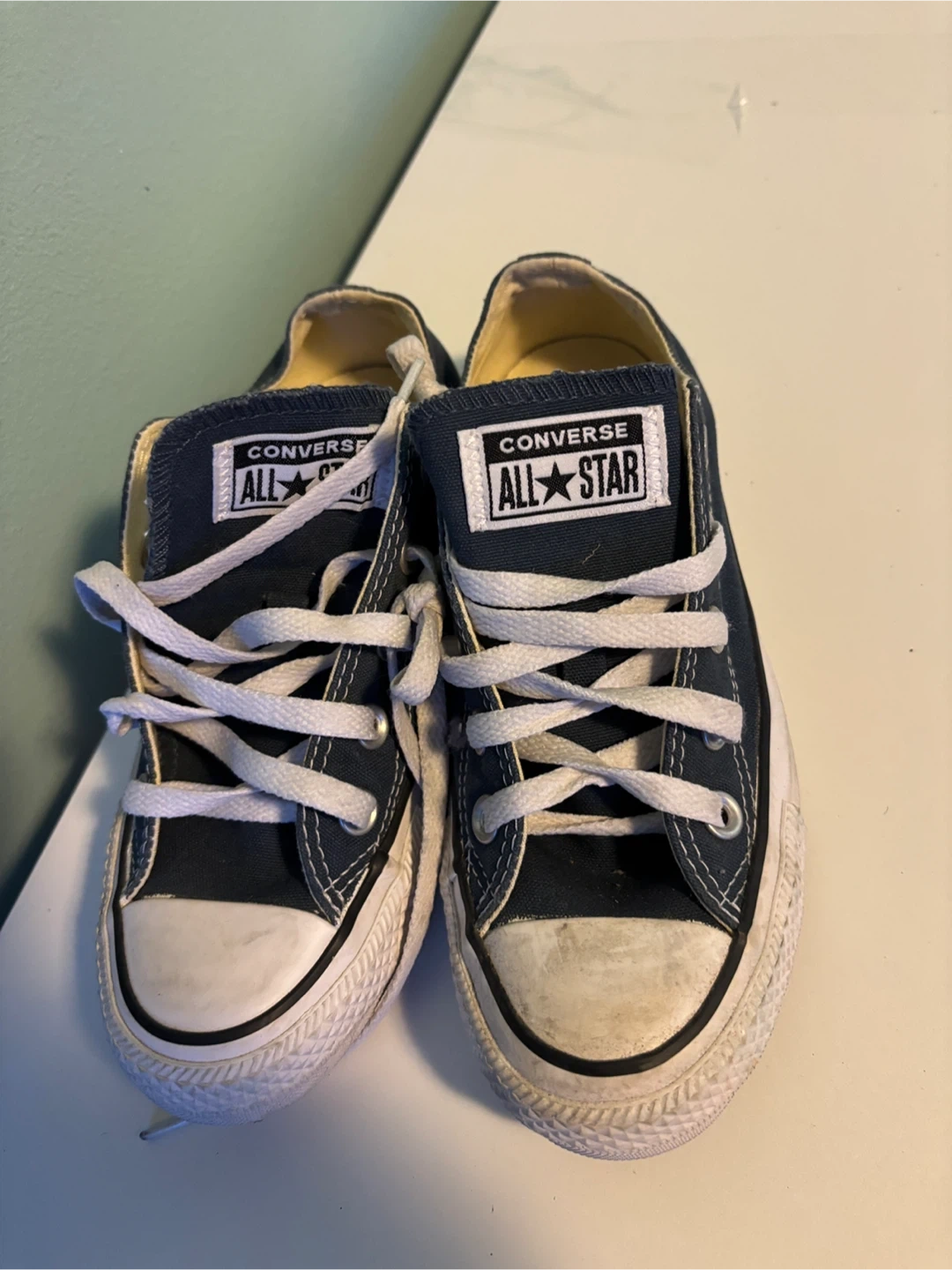 Classic navy blue Converse All Star low top sneakers. These shoes feature the iconic Chuck Taylor design with a rubber toe cap and white laces. Made with canvas uppers and a rubber sole.