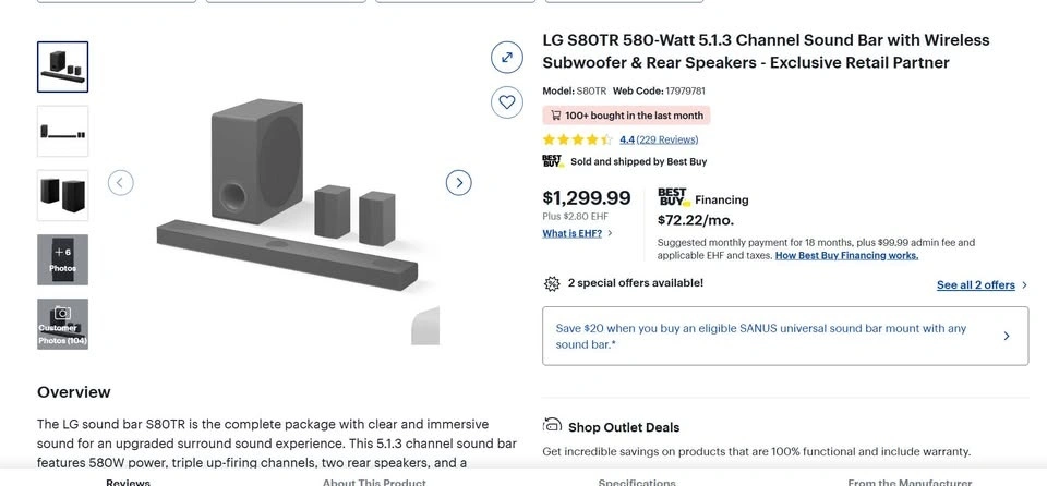 LG S80TR 5.1.3 Channel Sound Bar w/ Wireless Subwoofer & Rear Sp