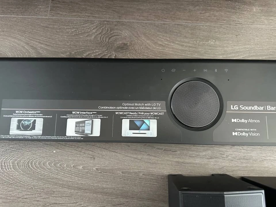 Excellent overall condition. Subwoofer has a minor cosmetic mark/dent on the top corner and some light marks/scratches as pictured; otherwise, everything else is like new. Perfect for LG C5 and G5 OLED TVs with WOWCAST Ready and WOW Orchestra. Comes with remote, optical cable, HDMI cable, and power cables. Retails for $1299 + tax. No wall mounting brackets included. Get ready for an unforgettable cinematic sound experience with this impressive 5.1.3-channel soundbar powered by Dolby Atmos and DTS:X technologies. The wireless rear surround speakers deliver an immersive audio experience. The up-firing center channel focuses on dialogue clarity. WOW Orchestra creates synchronized audio from your LG TV and soundbar. WOW Interface lets you control both with one remote. WOWCAST Built-in with Wireless Dolby Atmos provides powerful surround sound without wires. Advanced Room Calibration optimizes audio settings for your room. Experience Immersive 3D Spatial Sound. Supports Google Assistant or Alexa, Chromecast, AirPlay 2, and more. Sound keeps up with VRR/ALLM for smooth, lag-free gaming up to 120Hz.