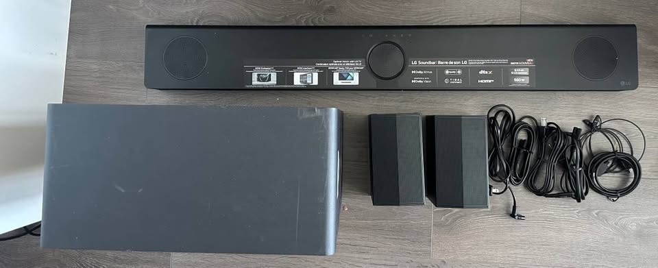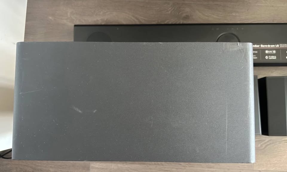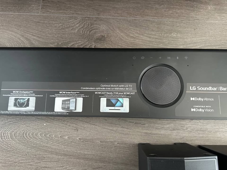 Excellent overall condition. Subwoofer has a minor cosmetic mark/dent on the top corner and some light marks/scratches as pictured; otherwise, everything else is like new. Perfect for LG C5 and G5 OLED TVs with WOWCAST Ready and WOW Orchestra. Comes with remote, optical cable, HDMI cable, and power cables. Retails for $1299 + tax. No wall mounting brackets included. Get ready for an unforgettable cinematic sound experience with this impressive 5.1.3-channel soundbar powered by Dolby Atmos and DTS:X technologies. The wireless rear surround speakers deliver an immersive audio experience. The up-firing center channel focuses on dialogue clarity. WOW Orchestra creates synchronized audio from your LG TV and soundbar. WOW Interface lets you control both with one remote. WOWCAST Built-in with Wireless Dolby Atmos provides powerful surround sound without wires. Advanced Room Calibration optimizes audio settings for your room. Experience Immersive 3D Spatial Sound. Supports Google Assistant or Alexa, Chromecast, AirPlay 2, and more. Sound keeps up with VRR/ALLM for smooth, lag-free gaming up to 120Hz.