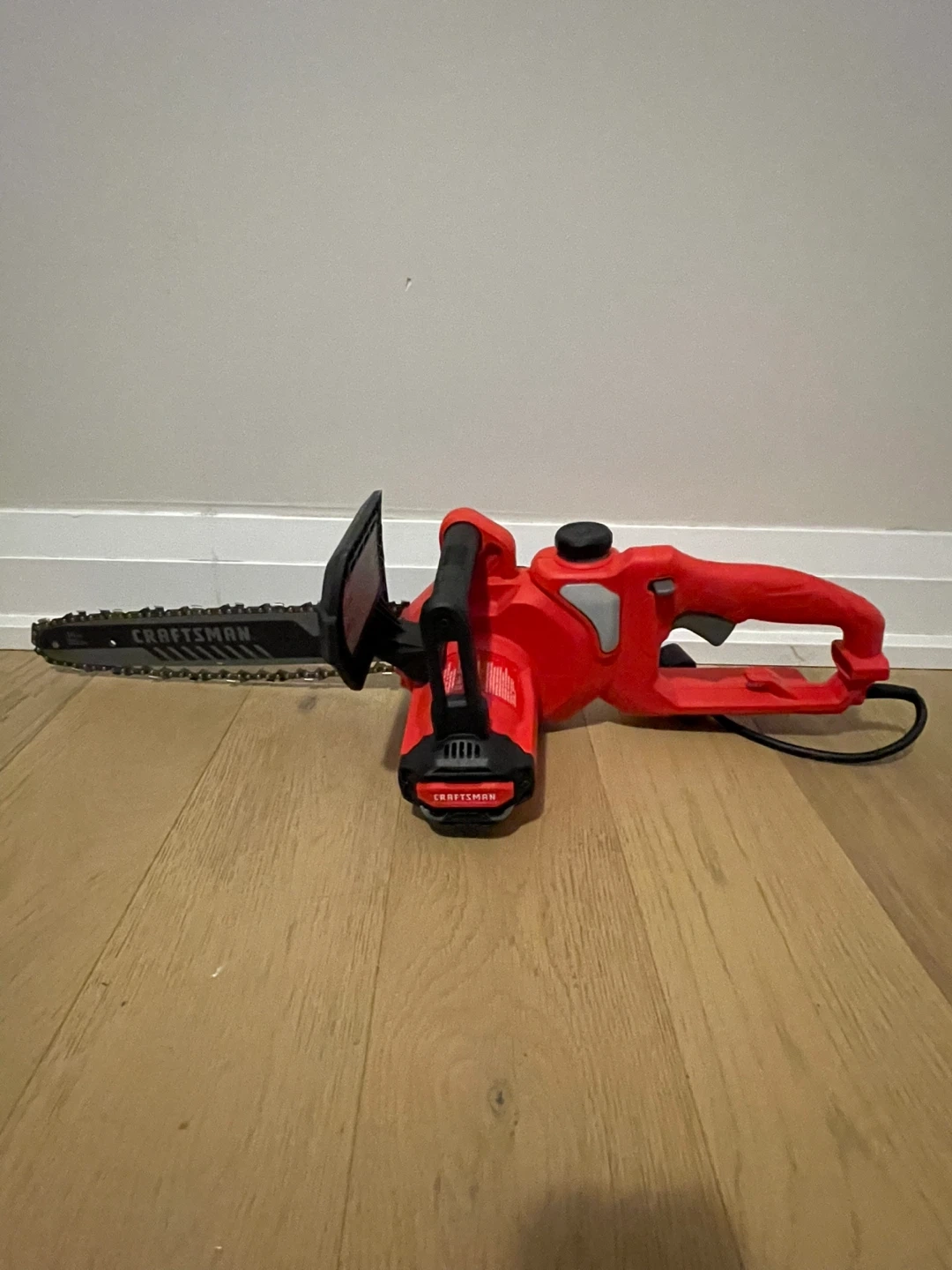 This is a red Craftsman electric chainsaw. It's corded and ready for your yard work! A handy tool for trimming branches or cutting smaller logs.