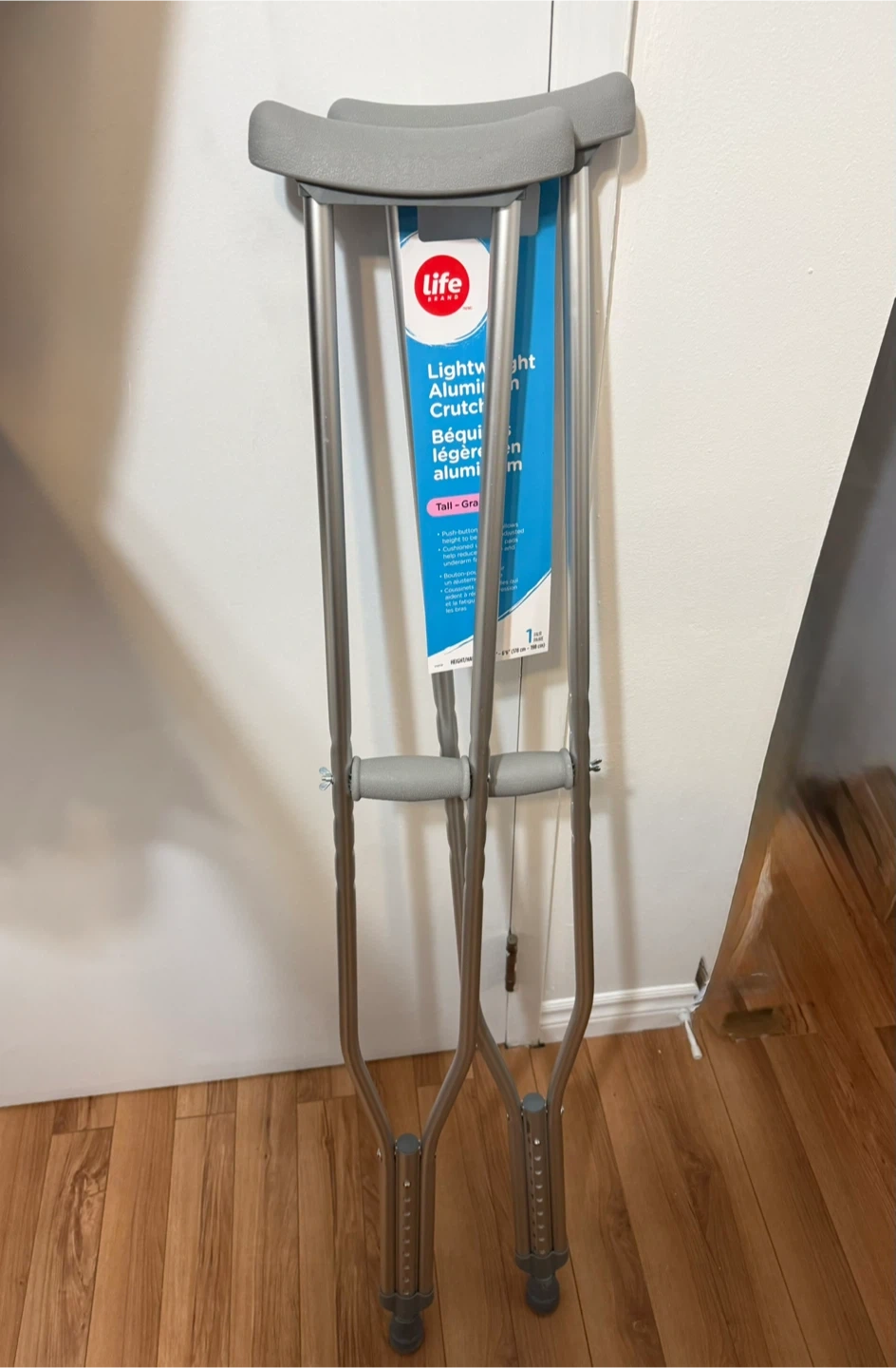 These are Life Brand lightweight aluminum crutches. They are a tall size in gray. The push-button height adjustment allows for easy customization. They have a durable aluminum construction.