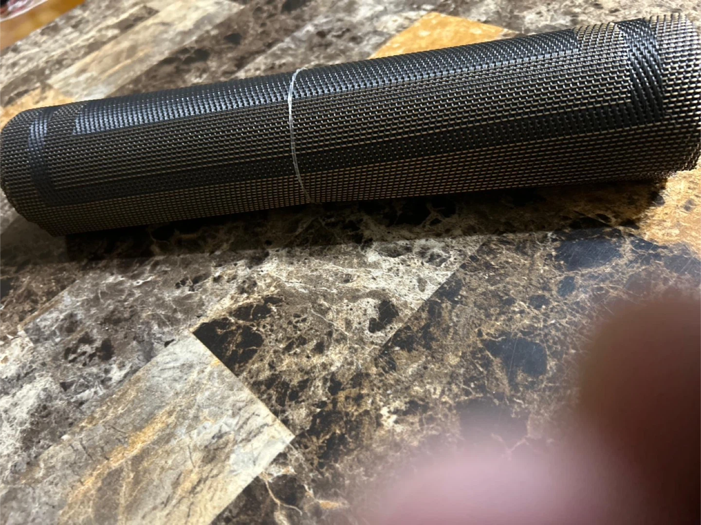 These new placemats are black and gold and have a woven texture. They're durable and easy to wipe clean. They'll protect your table from spills and scratches. When not in use, they can be rolled up for convenient storage.
