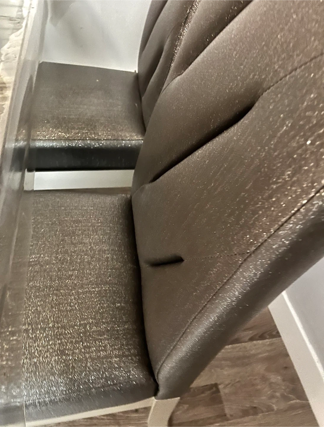 This dining set features a clear glass tabletop with a textured silver base. It comes with four upholstered chairs in a dark grey, textured fabric. Chairs have silver metal legs. Tabletop is glass with a textured silver base and support.