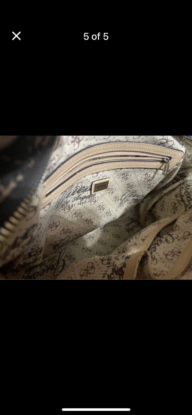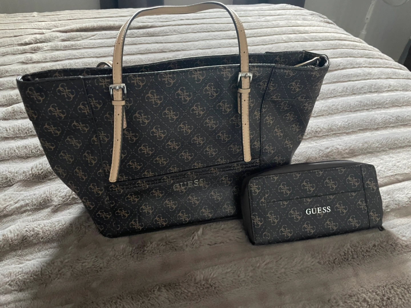 Brown GUESS purse and matching wallet. Beige accents. Zipper closures. Multiple compartments. Great for everyday use.