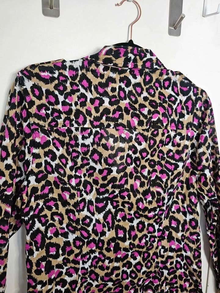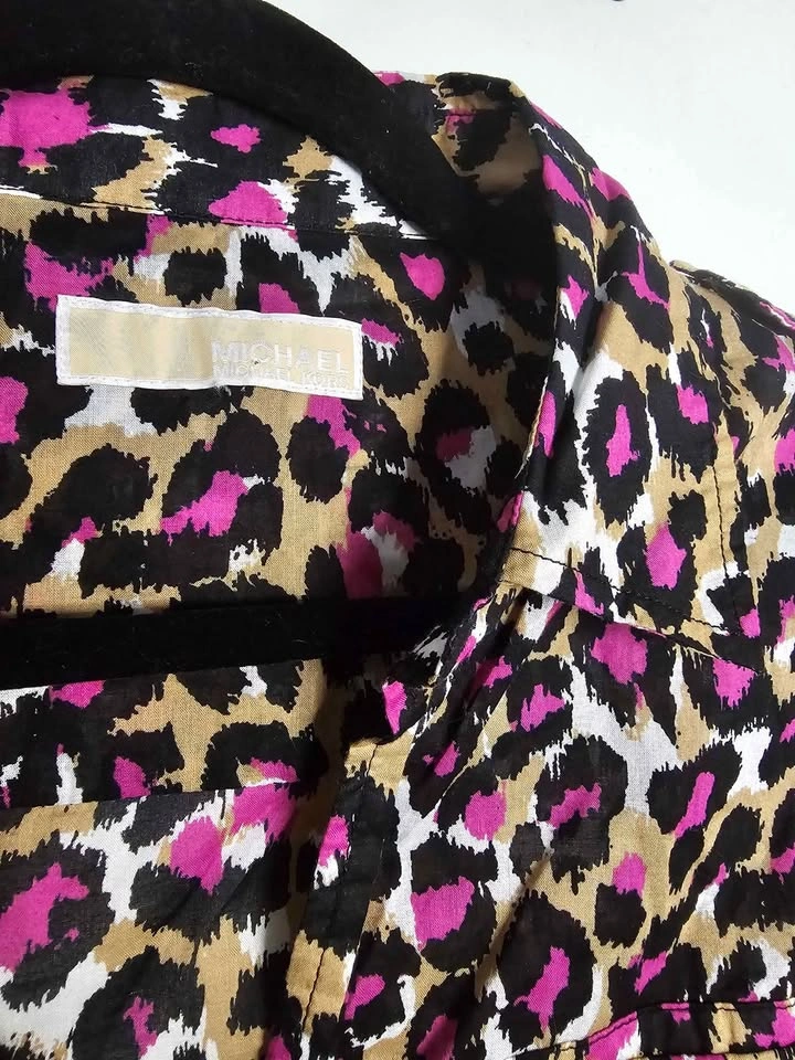 Stylish and bold leopard print button-up blouse from Michael Kors. Blouse is white, tan, black and bright pink. The fabric is a lightweight and soft 100% cotton, it is fairly thin and the blouse is somewhat sheer due to that. It has chest pockets, small shoulder epaulets, and does up with tan colored buttons with Michael Kors logos on each. A fun statement top to wear unbuttoned as a summer cover-up or on its own with cute jeans or shorts!