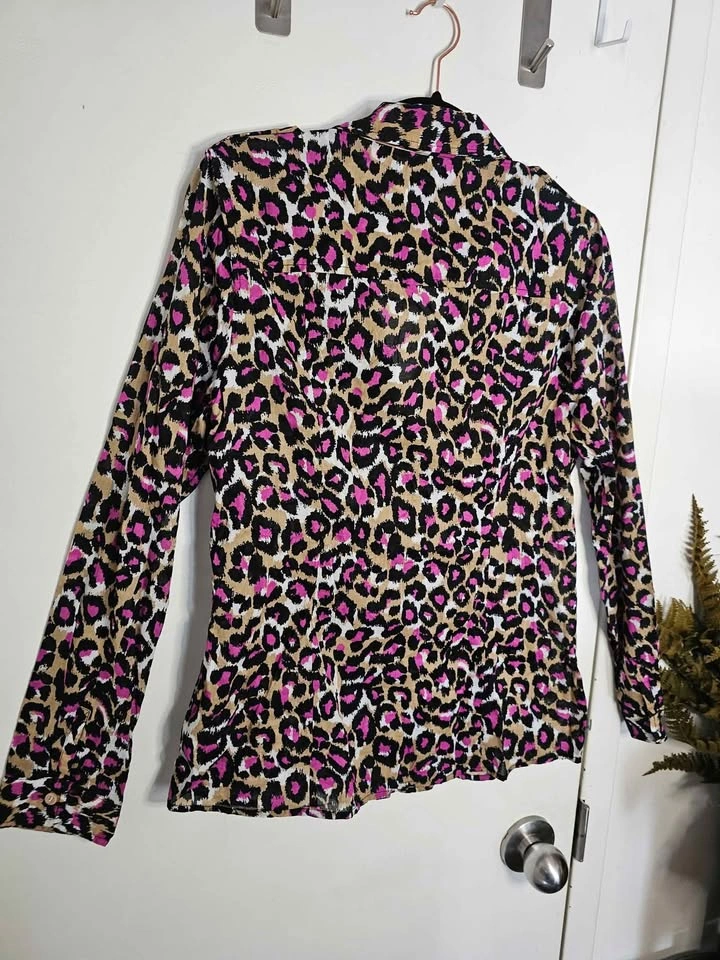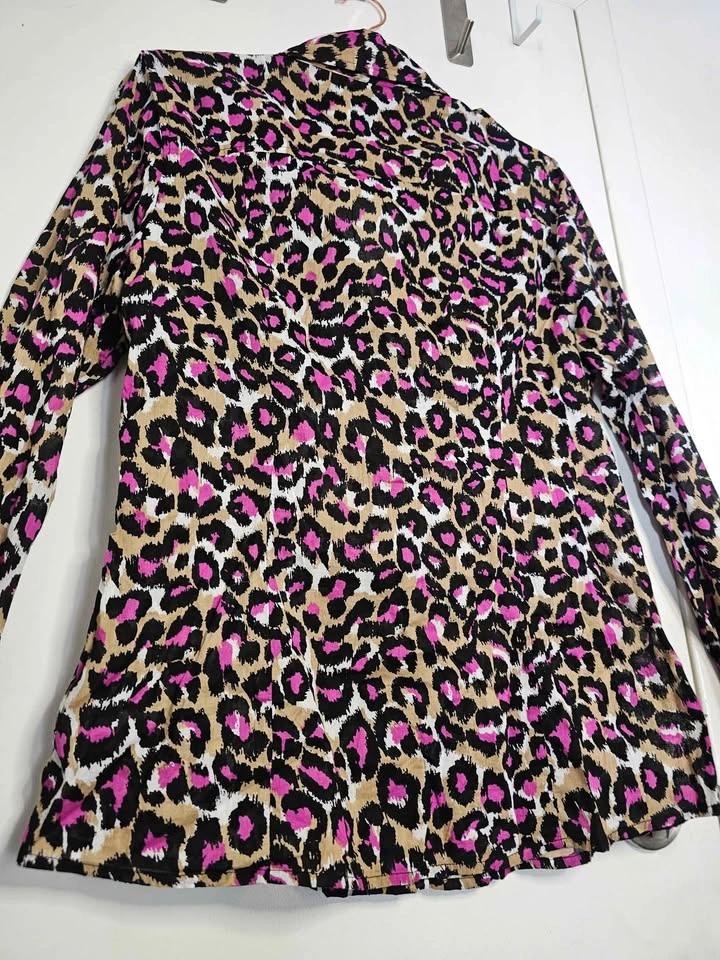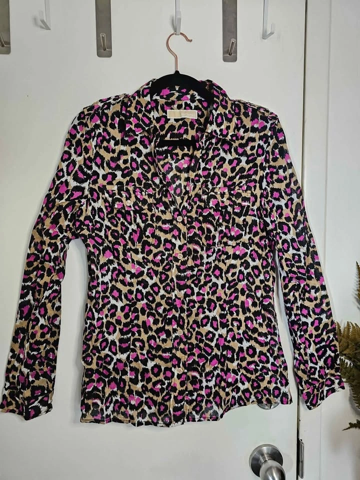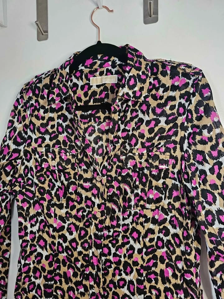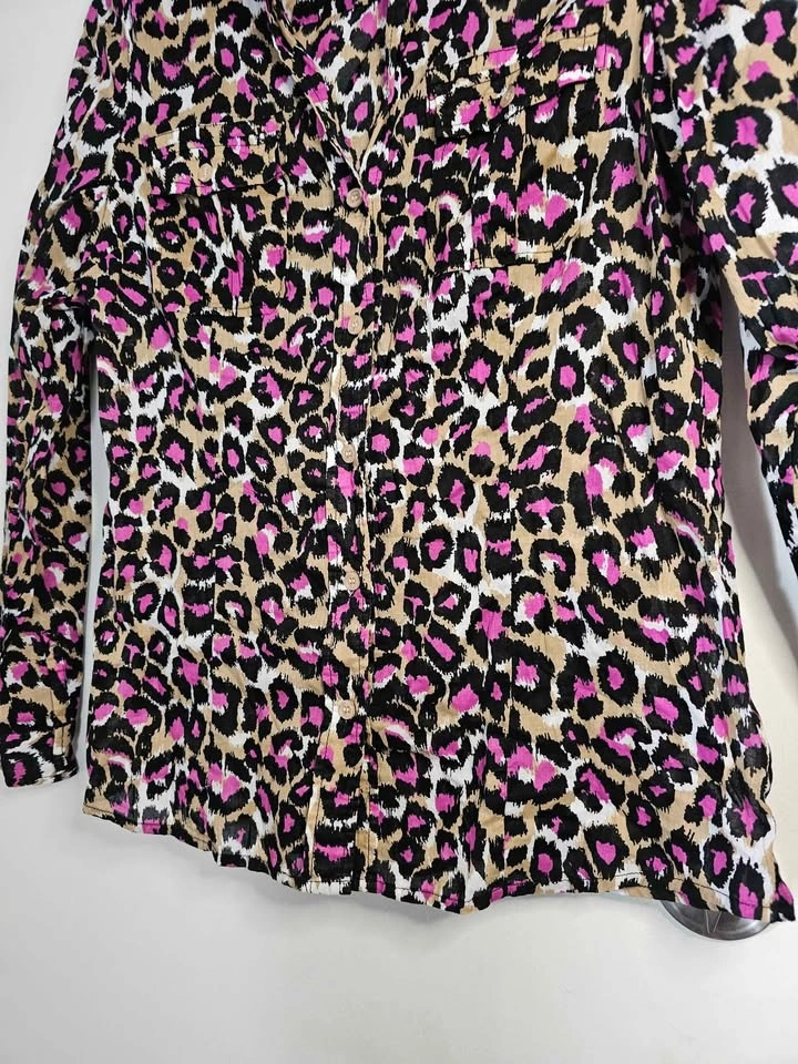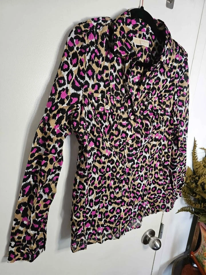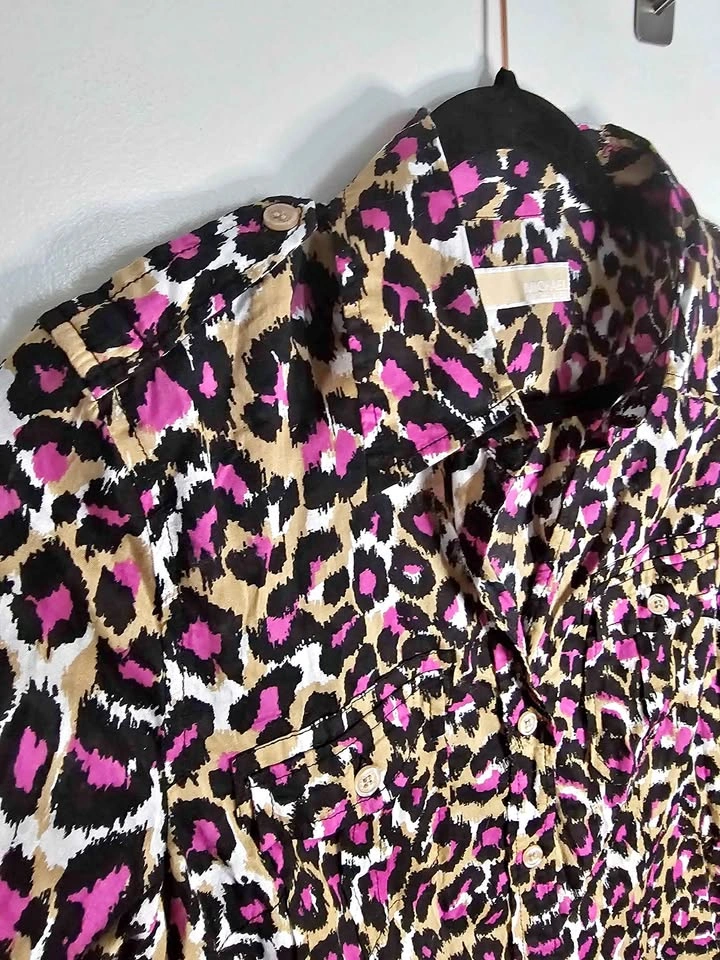 Stylish and bold leopard print button-up blouse from Michael Kors. Blouse is white, tan, black and bright pink. The fabric is a lightweight and soft 100% cotton, it is fairly thin and the blouse is somewhat sheer due to that. It has chest pockets, small shoulder epaulets, and does up with tan colored buttons with Michael Kors logos on each. A fun statement top to wear unbuttoned as a summer cover-up or on its own with cute jeans or shorts!
